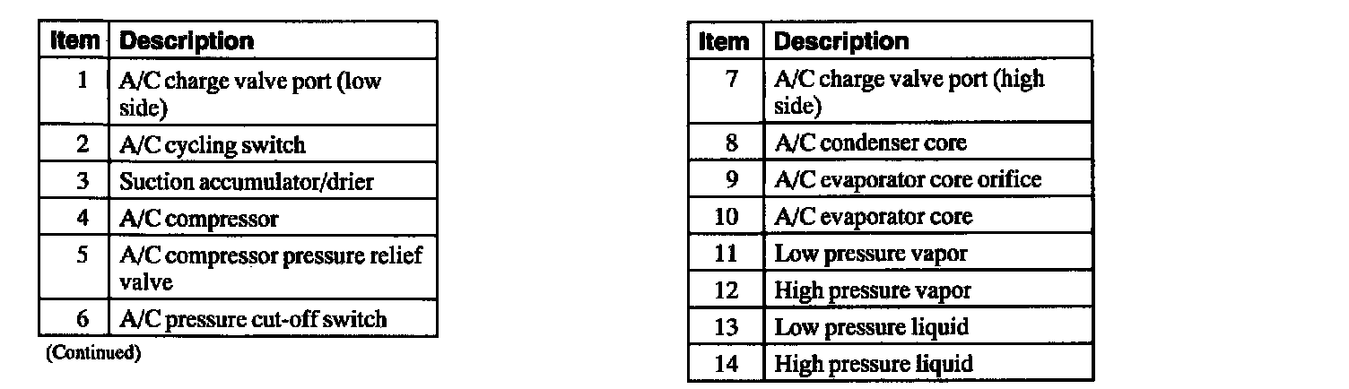 ^ The A/C refrigerant of all vehicles must be identified and analyzed prior to refrigerant charging. Failure to do so can contaminate the shop bulk refrigerant and other vehicles.