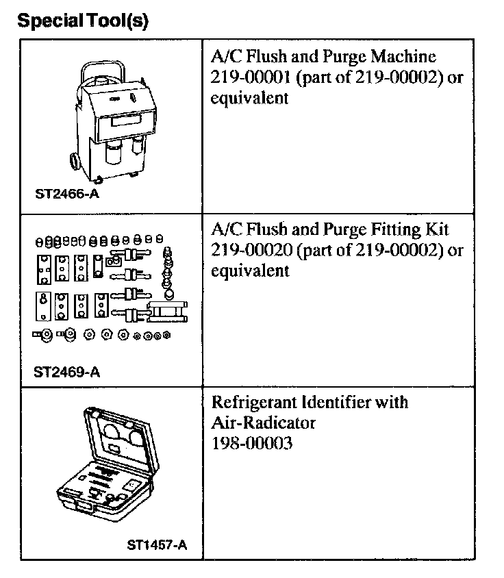 ^ Only the A/C Flusher Kit, 219-00002 which includes A/C Flusher 219-00001, A/C Flusher Fitting Kit 219-00020, and the Ford Part number F4AZ-19579-A A/C System Flushing Solvent, is approved for use on Ford vehicles. No other flushing device or solvent is approved for flushing heat exchangers. Use of any other flusher or solvent may cause damage to the A/C system and the flushing unit.