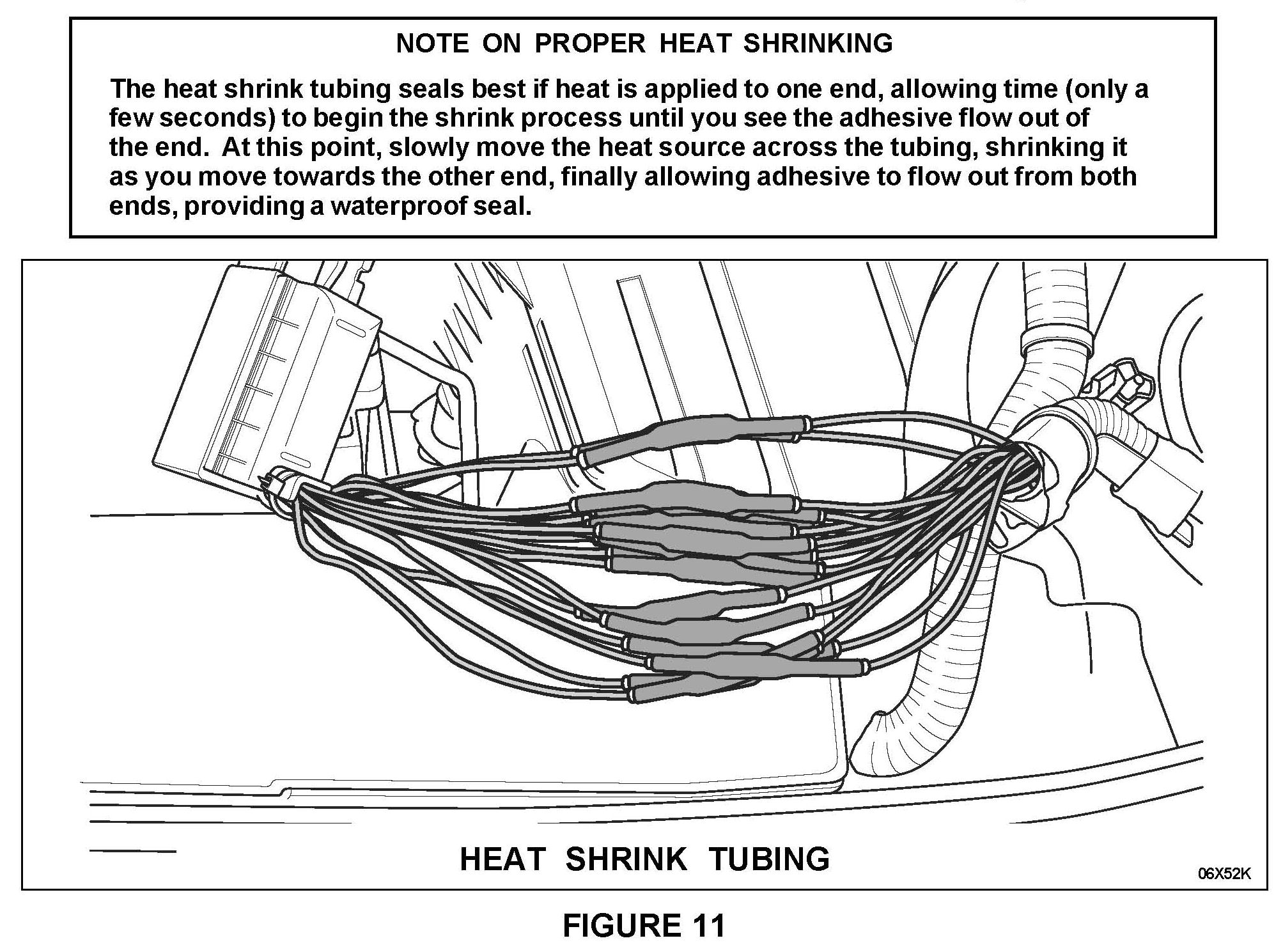 6. After soldering the wires, center each piece of heat shrink tubing over the splice. Then, using the flameless heat gun provided in the Rotunda Kit, shrink one piece of tubing at a time until the adhesive flows out of both ends. Continue until all wires are insulated. See Figure 11.