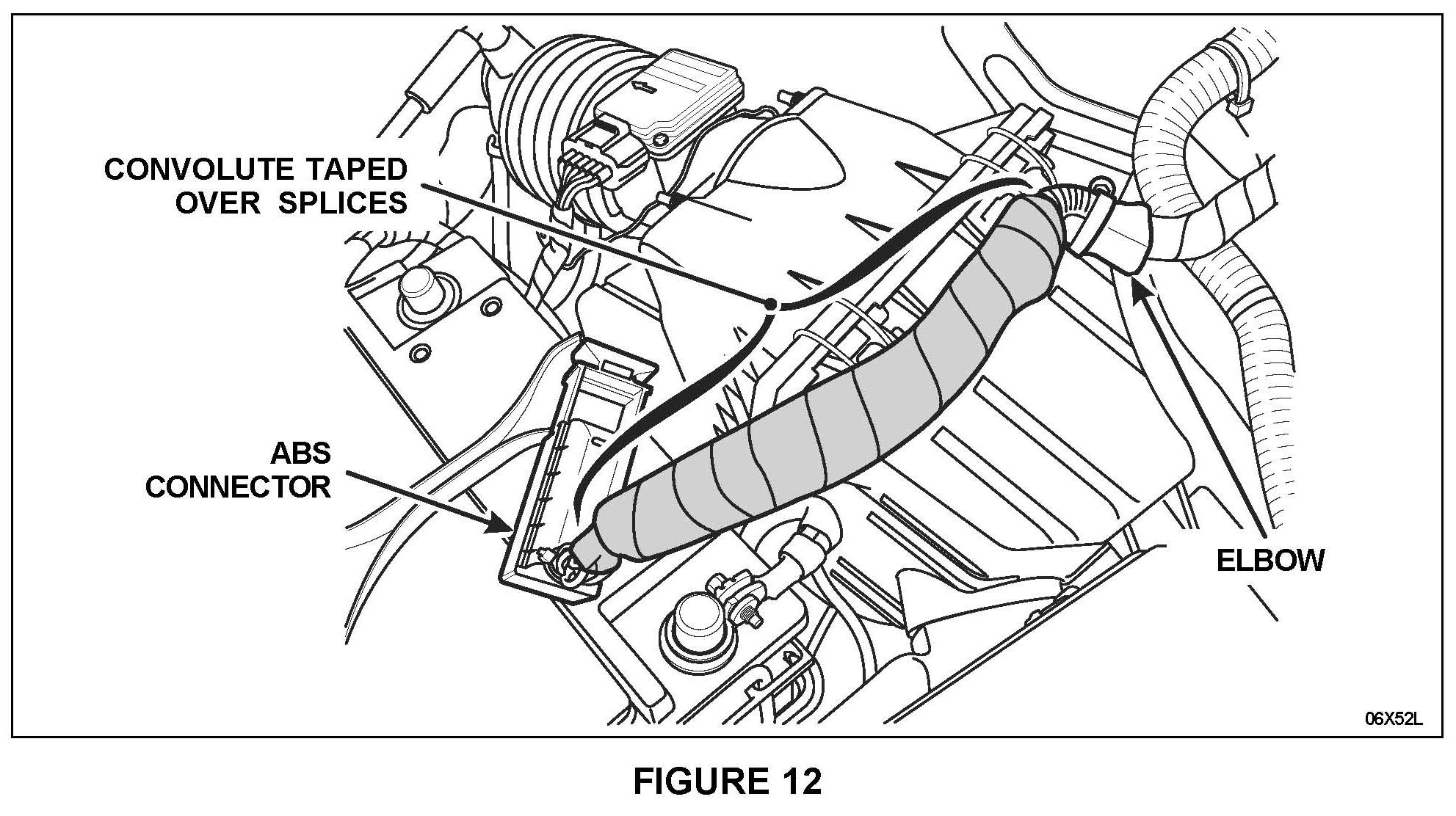 7. Install the supplied convolute tubing over the spliced area and secure with electrical tape. Apply tape to the entire length of the convolute and be sure to secure the convolute to the elbow at one end, and as close as possible to the ABS connector on the other. See Figure 12.