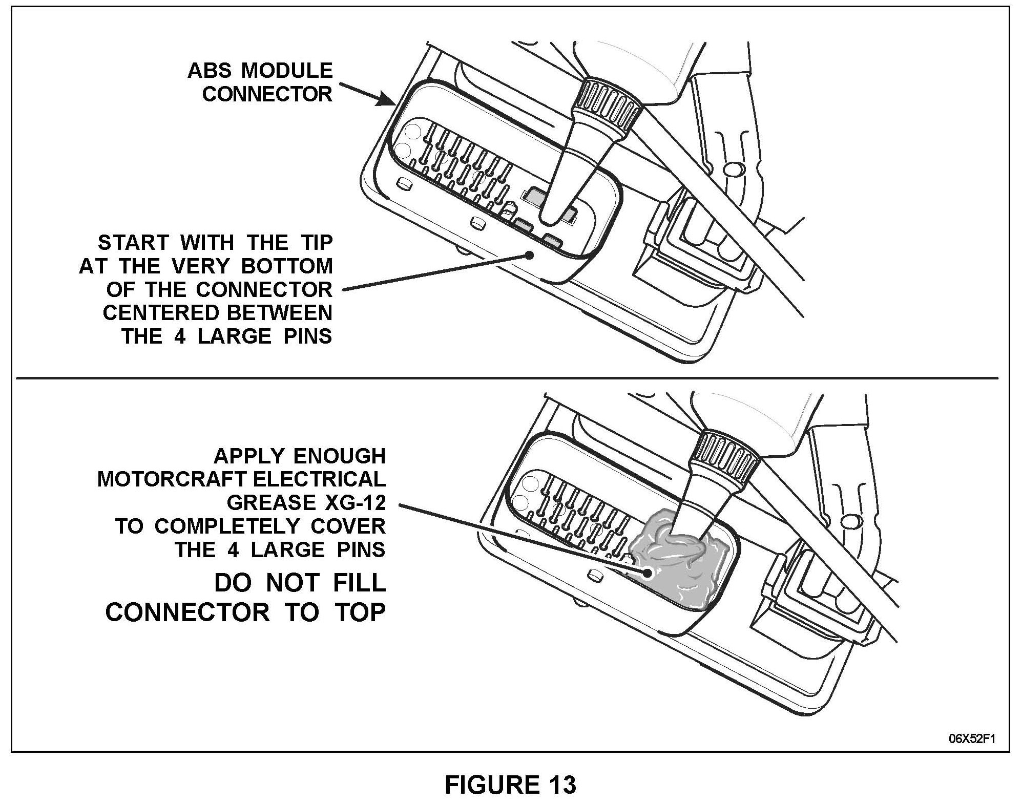 - With the tip of the applicator tube snipped off, position the end of the tip between the 4 large flat pins at the bottom of the ABS module connector. Squeeze out enough grease to completely cover the 4 flat pins. See Figure 13. DO NOT spread the grease around the connector. Applying an excess amount of grease into the connector cavity will cause a hydro lock" condition in which the connector will not be able to be seated fully or locked in place.