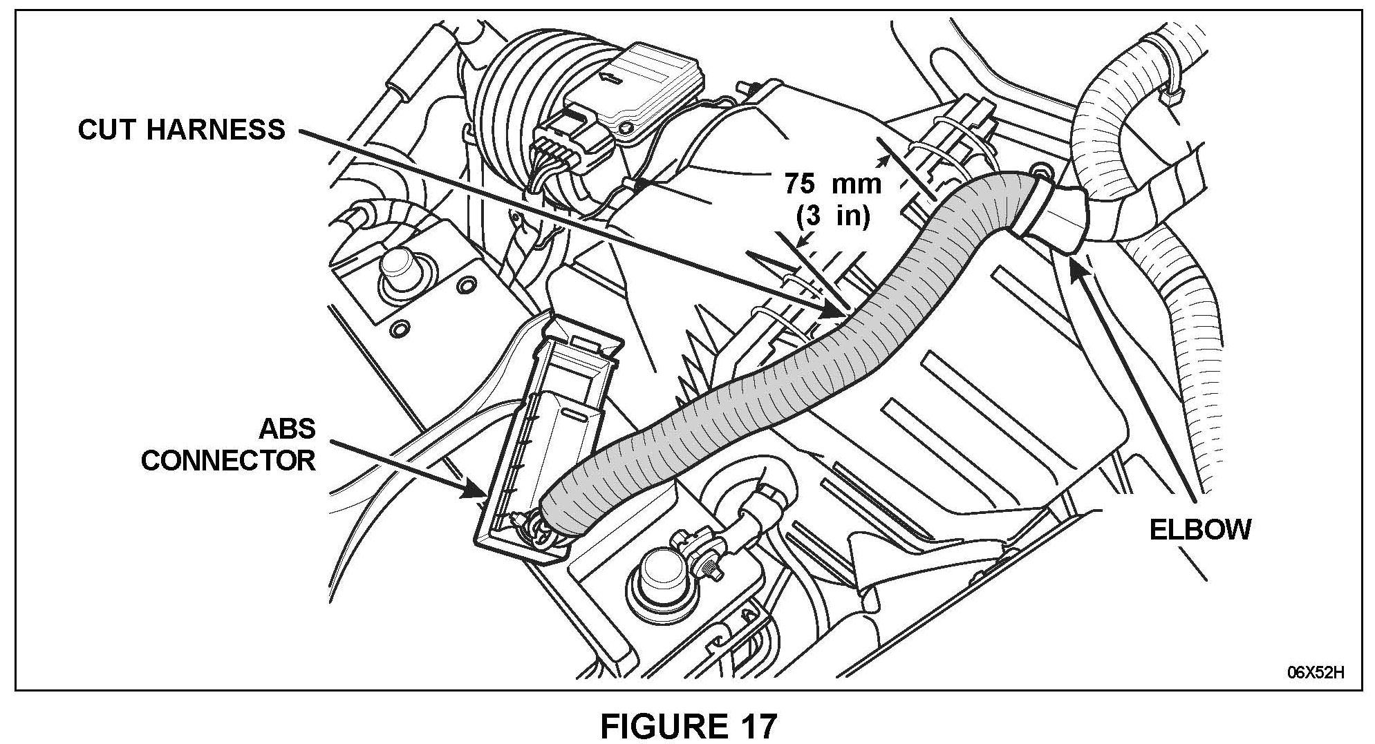 2. Measure approximately 75 mm (3 in) from the end of the elbow towards the ABS module connector, then, using suitable wire cutters, cut the harness (all wires) to the same length. See Figure 17.
