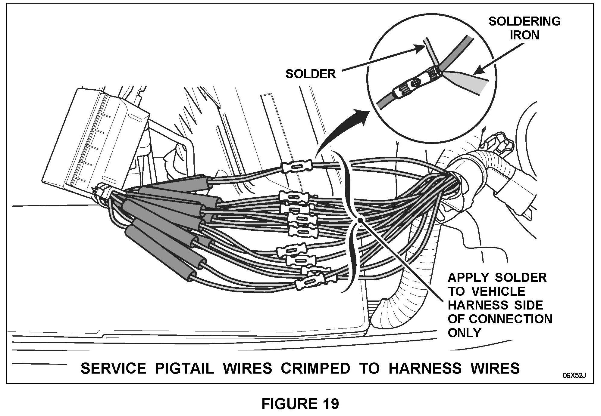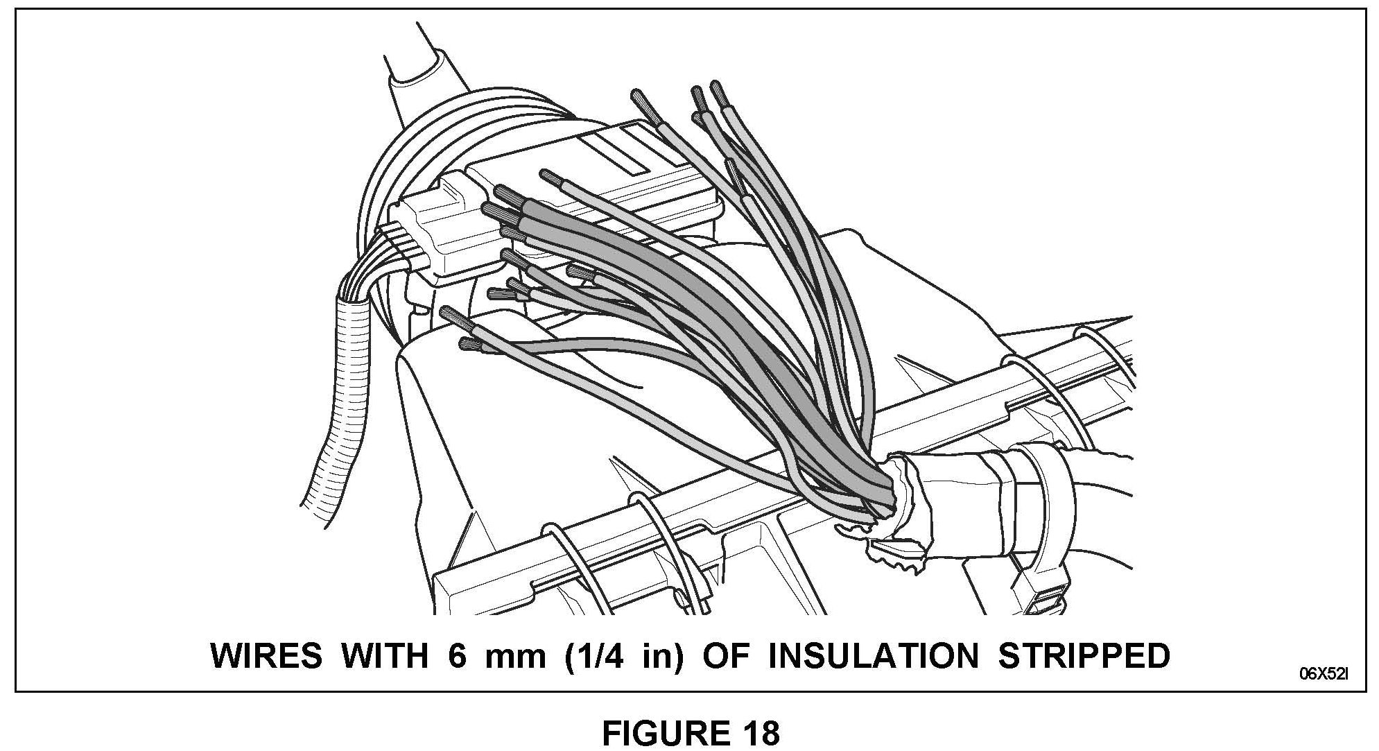 3. Strip approximately 6 mm (1/4 in) of insulation from each of the cut wires in the harness. See Figure 18.