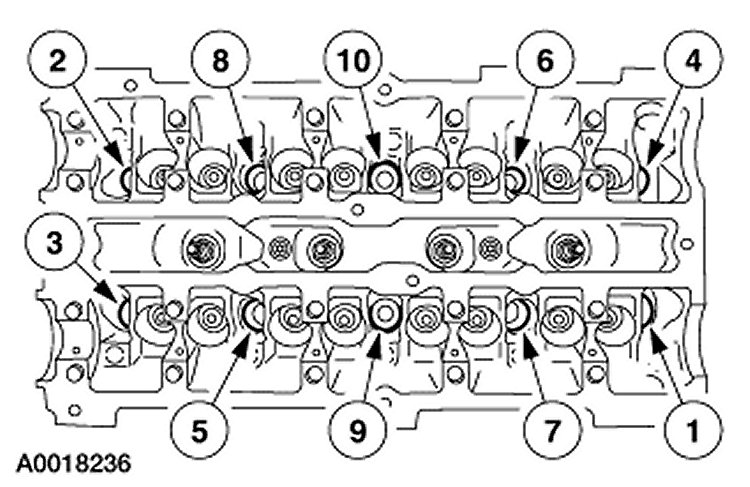 Install the cylinder head and tighten the bolts in three stages using the sequence shown: