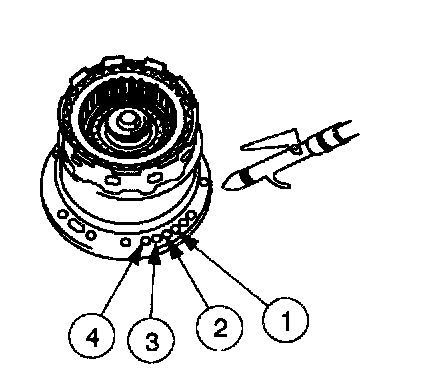 Check the following passages of the forward/coast/direct clutch cylinder and reverse clutch drum with moisture-free compressed air, regulated to 276 kPa (40 psi).
