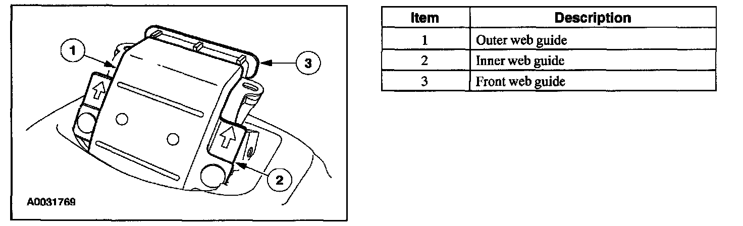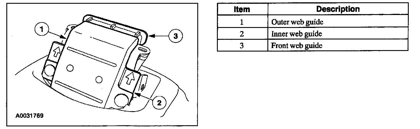 6. Install the front and outer safety belt web guides, while placing the safety belt in between outer and inner safety belt guides.