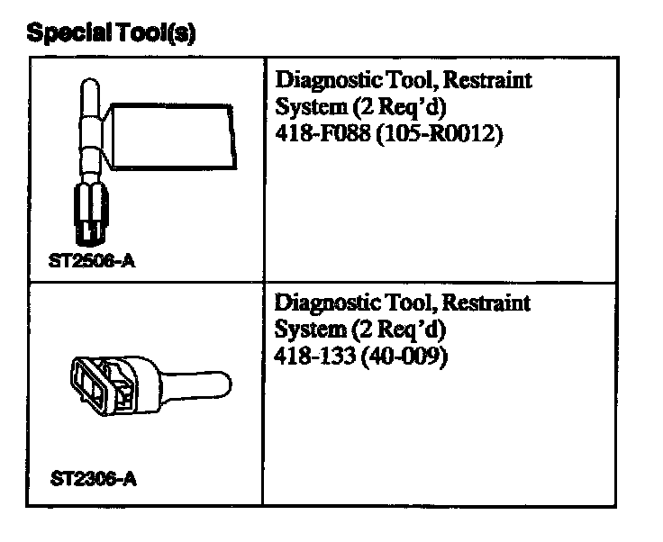 ^ Restraint system diagnostic tools MUST be installed under the seats in the seat side air bag (if equipped) and safety belt pretensioner (if equipped) to floor connectors.