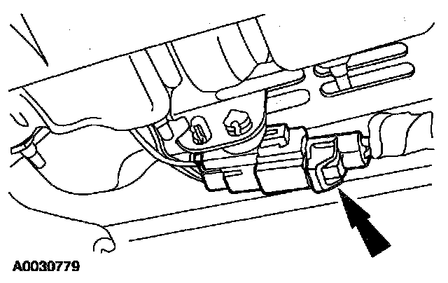 27. From under the passenger seat, push in to release the tab and disconnect the passenger seat safety belt buckle pretensioner electrical connector.