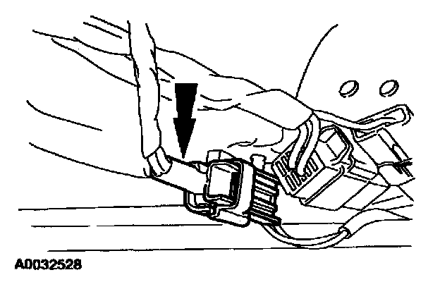 11. Push in to release the tab and disconnect the passenger side safety belt retractor pretensioner electrical connector.