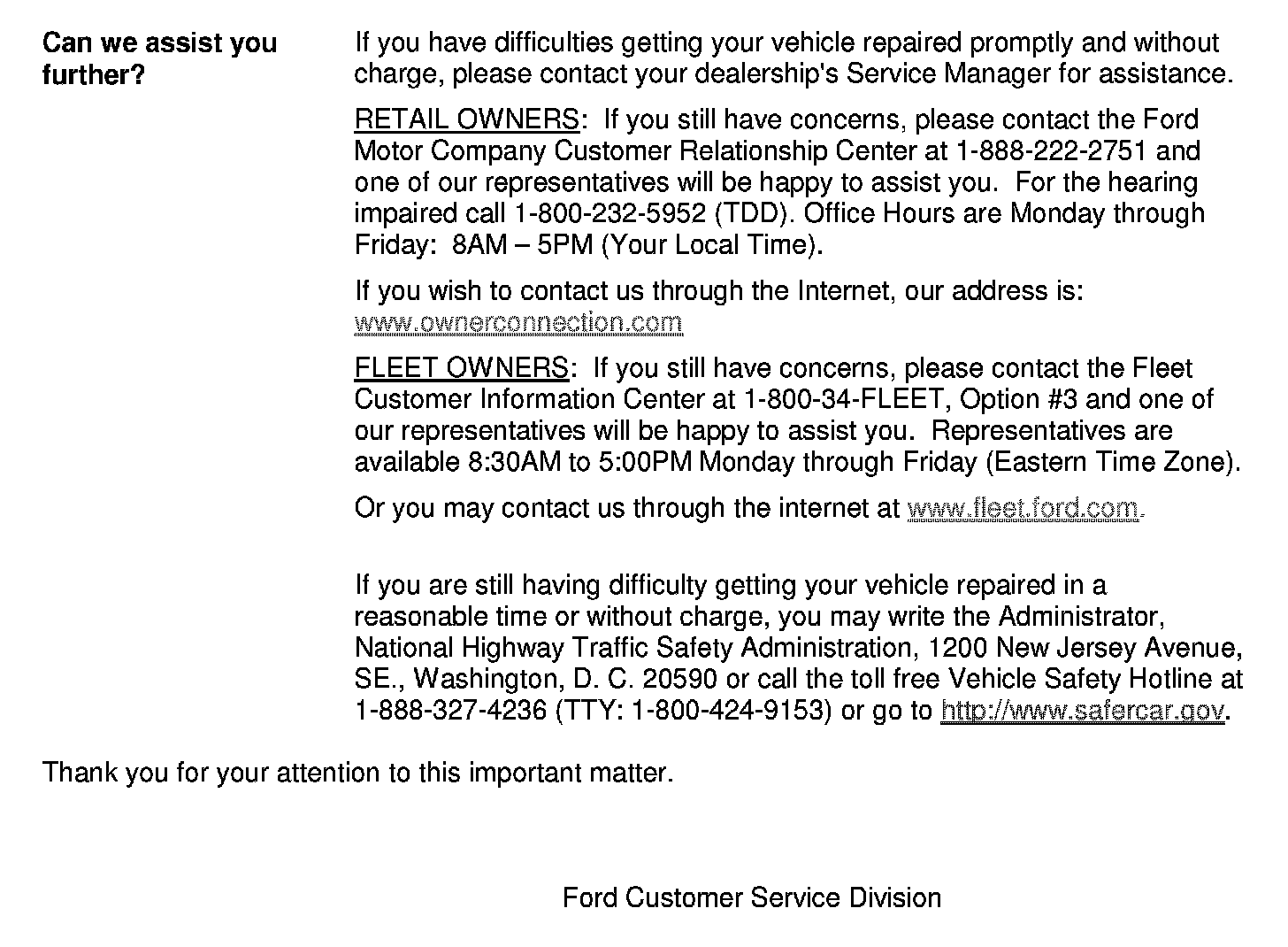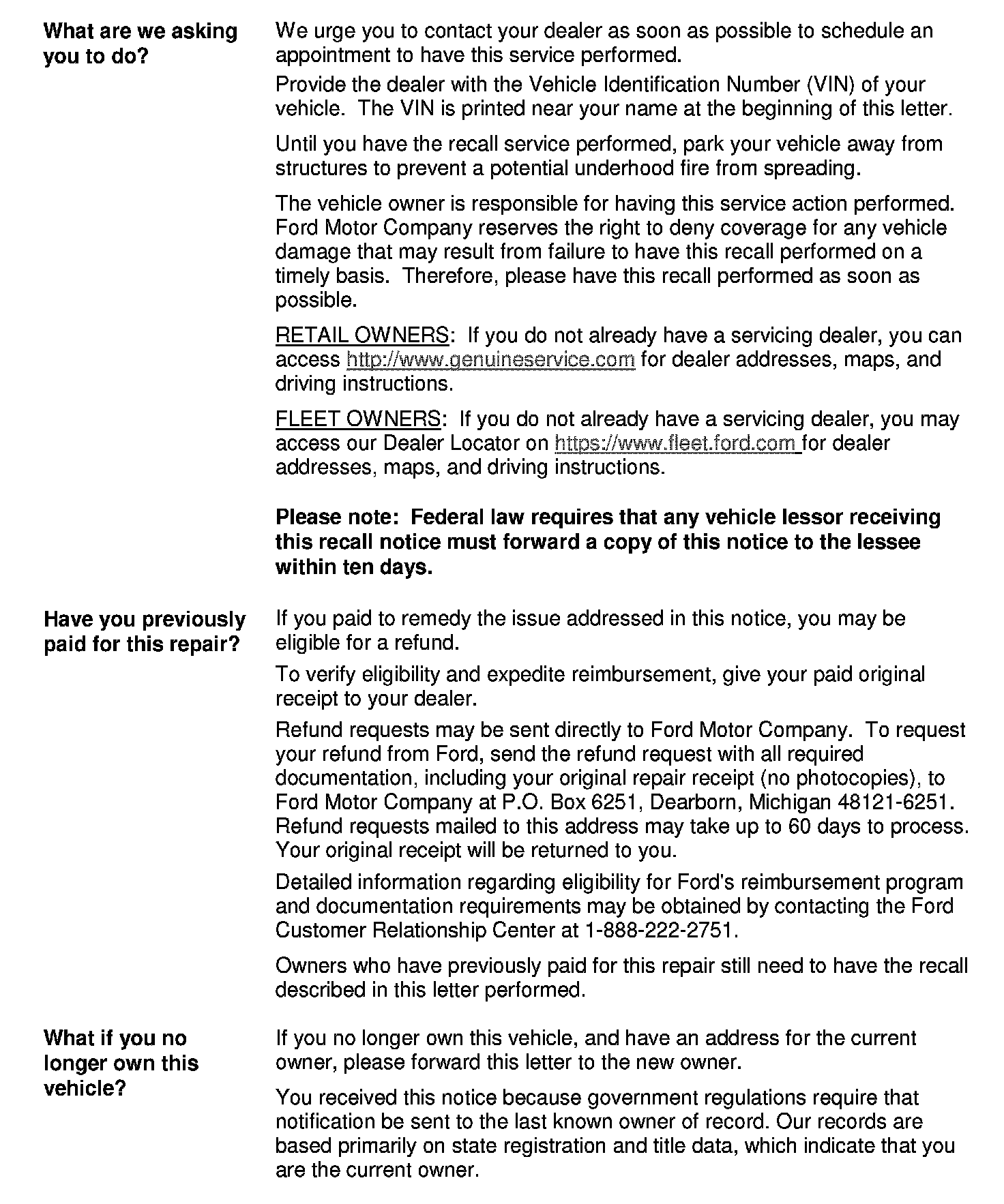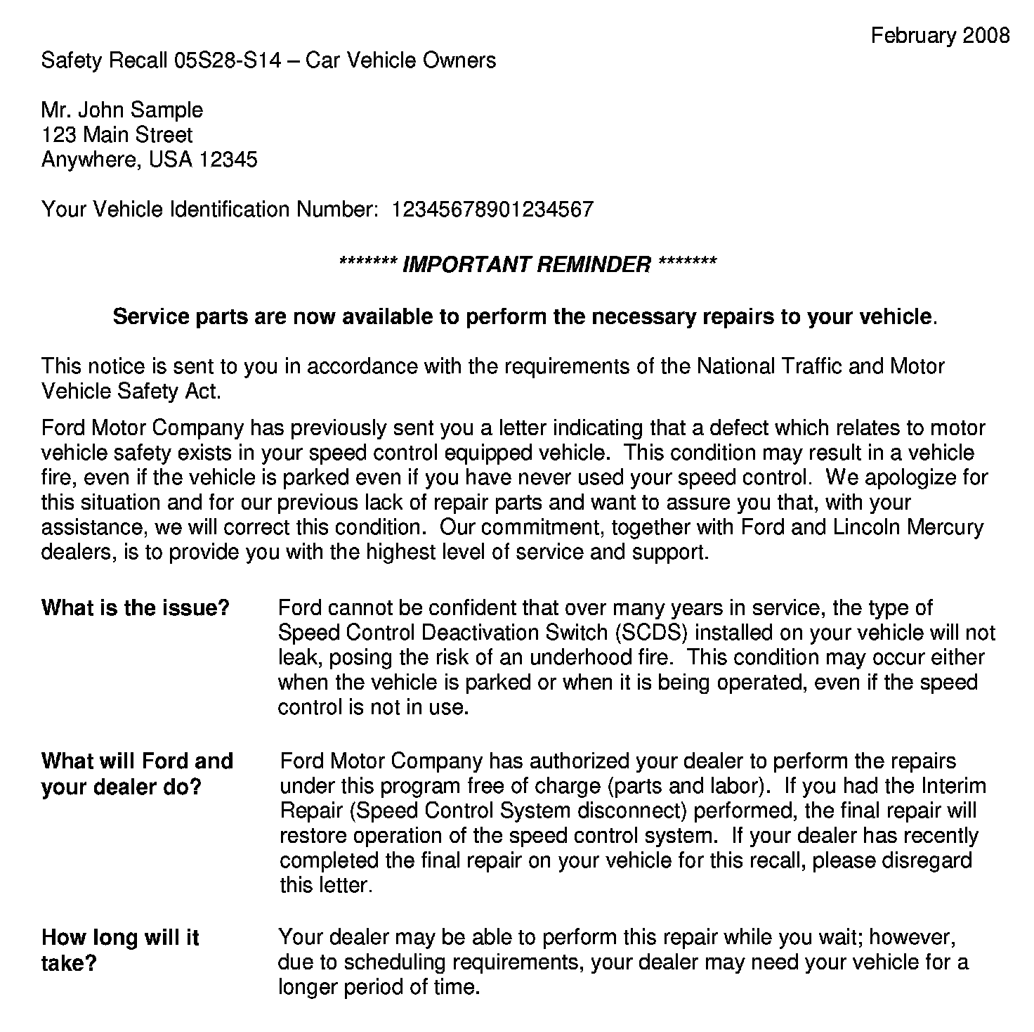 Important Reminder Owner Letter - Car - Parts Available