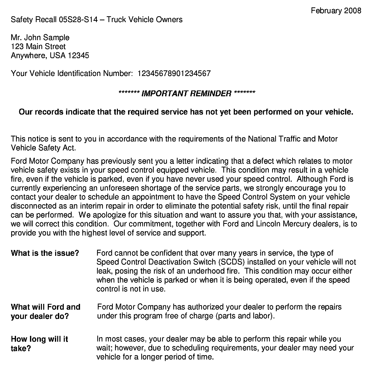 Important Reminder Owner Letter - Truck - Required Service Not Performed Yet