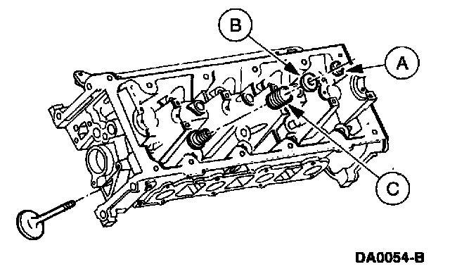 Remove the (A) valve spring retainer keys, the (B) valve spring retainers, the (C) valve springs, and the valves.