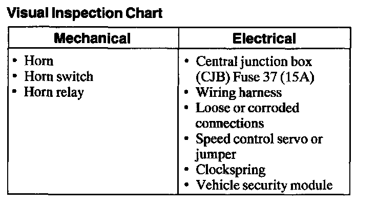 1. Verify the customer concern by operating the horn system.Visual Inspection Chart: