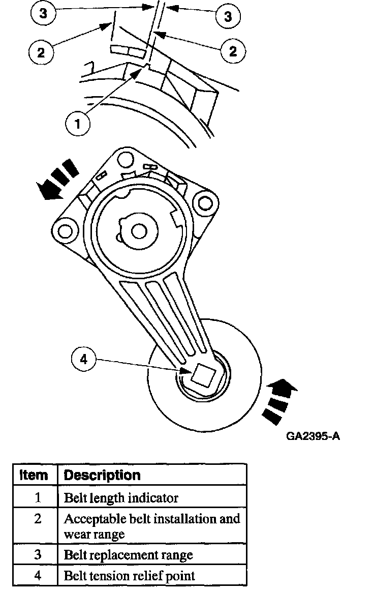 The drive belt is too long. A drive belt that is too long will allow the drive belt tensioner arm to go all the way to the arm travel stop under certain load conditions, which will release tension to the drive belt. If the drive belt tensioner indicator is outside of the wear range window, install a new drive belt.