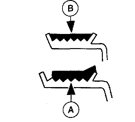 With the engine running, check drive belt tracking. If the (A) edge of the drive belt rides beyond the edge of the pulleys, noise and premature wear may occur. Make sure the (B) drive belt rides correctly on the pulley. If a drive belt tracking condition exists, proceed with the following: