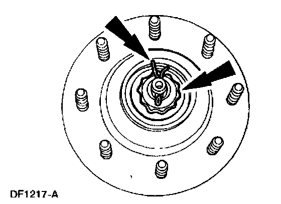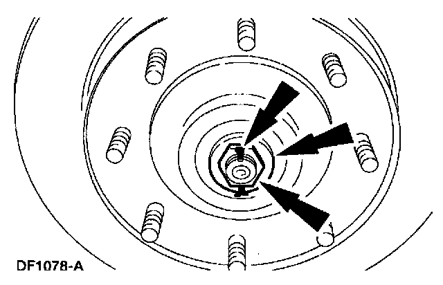 Wheel Bearing Adjustment - F-250, F-350, F-450, F-550CAUTION: Wheel seals on the front axles must be replaced any time the axle lubricants are changed from factory-installed mineral lube to synthetic lube or vice versa. If bearings are adjusted too tightly, they will overheat and wear rapidly. An adjustment that is excessively loose can cause pounding and contribute to uneven tire wear, steering difficulties and inefficient brakes. Check bearing adjustment at regular inspection intervals. New wheel seals must be installed when the hub is removed. A damaged or worn seal can permit bearing lubricant to reach the brake linings, resulting in ineffective brake operation and necessitating premature replacement of linings. To check the wheel bearing adjustment, raise the front of the vehicle. Grasp the tire at the sides, and alternately push inward and pull outward on the tire. If any looseness is felt, adjust the front wheel bearings as follows.