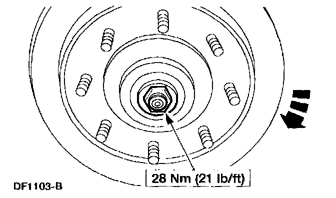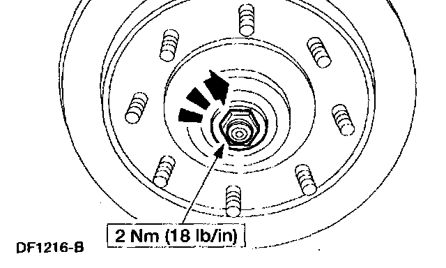 5. While rotating the wheel, tighten the adjusting nut to specification as illustrated. Torque required to rotate the hub should be 2 Nm (18 inch lbs.).