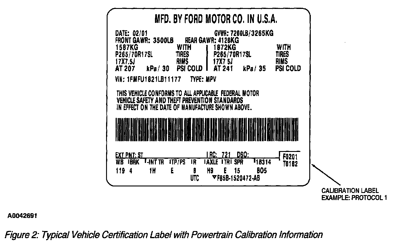 Powertrain Base Calibration Information is located in the lower right corner of the Vehicle Certification Label. Only the Base Calibration will appear on this label (Figure 2). The Revision Level is no longer printed on the label; however, it can be found in On-Line Automotive Service Information System (OASIS). For the current model year Ford Motor Company is using two different Protocols which describe Powertrain Base Calibration. The Protocols are designed to provide worldwide standardization for vehicle calibration. If Electronic Engine Control (EC)'s strategy is two years old and carried over to the current model year, Protocol 1 is used (see table 1). One year old and new strategies for the current model year use Protocol 2 (see table 2). For more information on Vehicle Certification Label or Powertrain Calibration, refer to the appropriate Vehicle Systems.