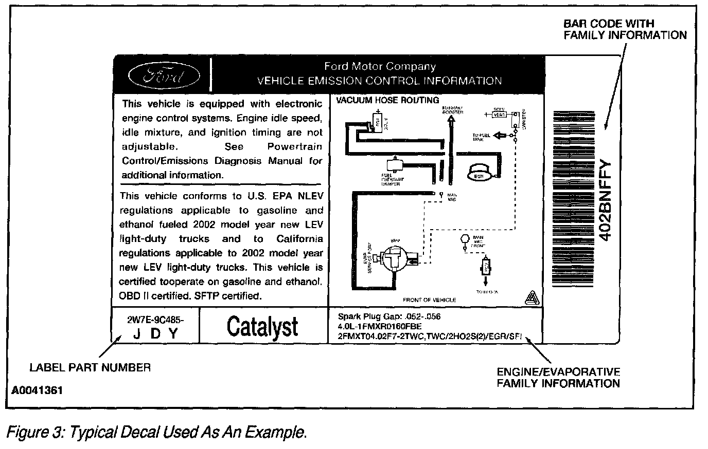 Both the engine family name and the evaporative family names are listed in the box on the emission decal as indicated in Figure 3 and 4, in the area marked as engine/evaporative family information. The first line is the spark plug information. The second line contains the engine size and the evaporative family name (12 characters). The third line contains the engine family name (12 characters) and other vehicle specific information.