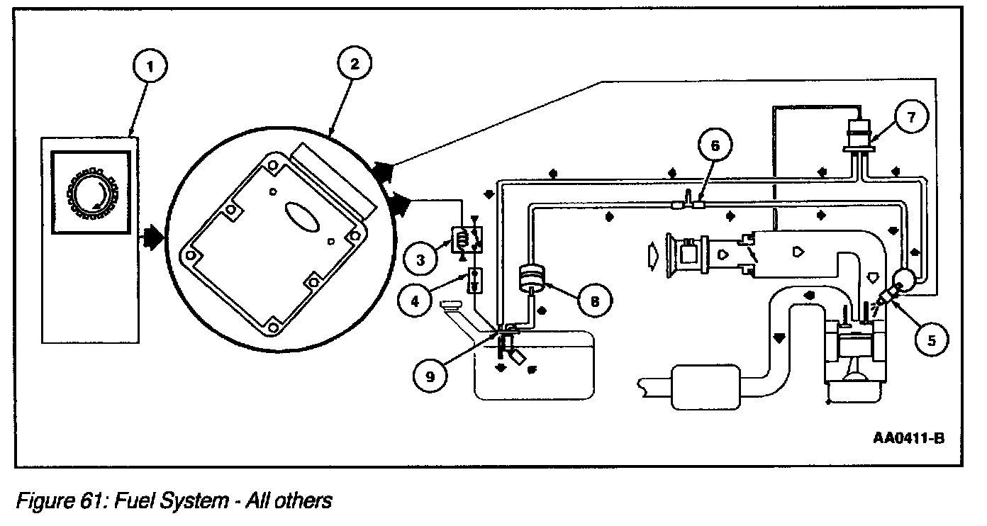 The fuel system consists of a fuel tank with a reservoir, fuel pump module, fuel supply lines, fuel filter(s), schrader/pressure test point, fuel rail, fuel injectors, and fuel pressure regulator. Operation of the system is as follows (refer to Figure 61 for all others):