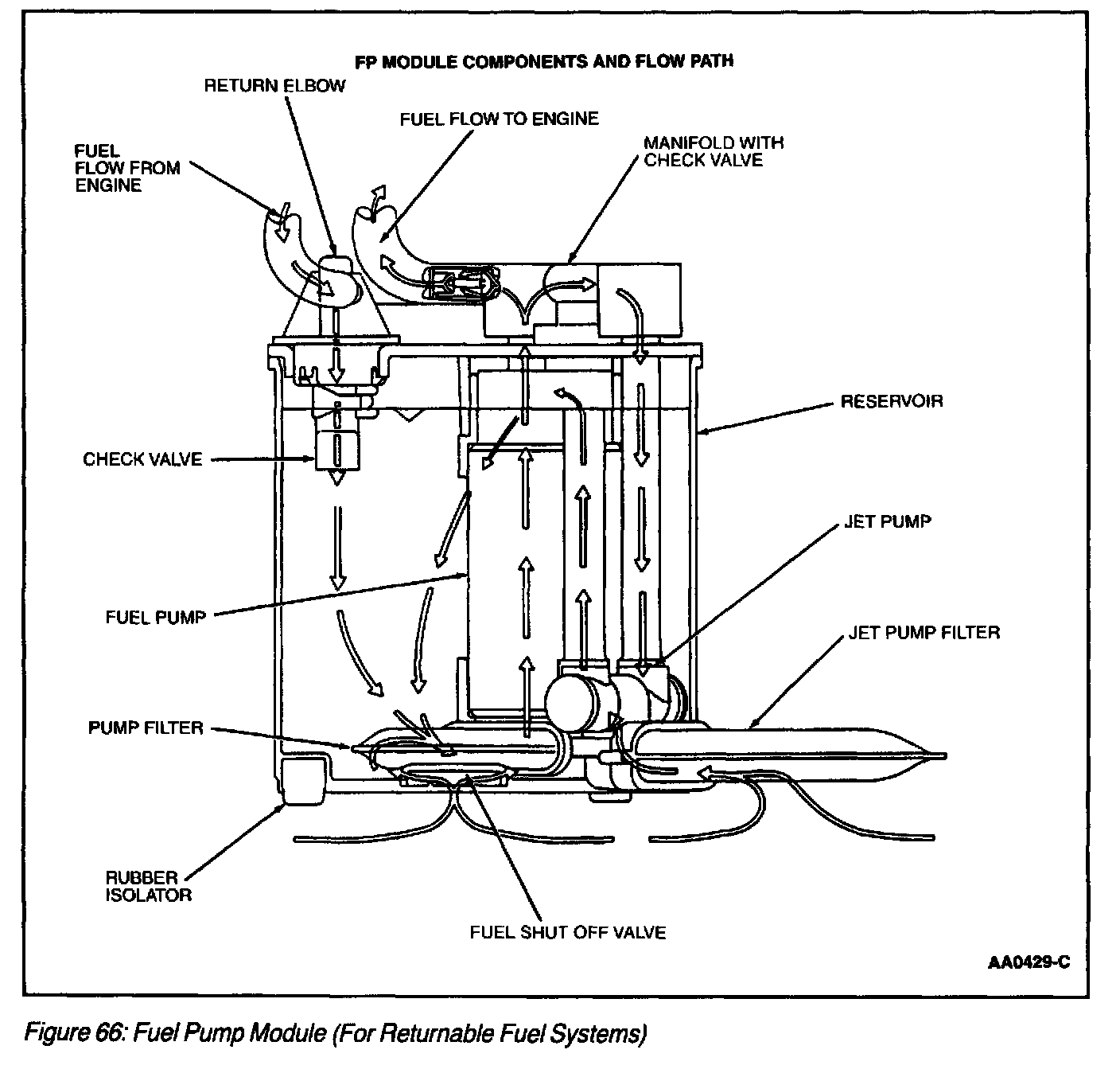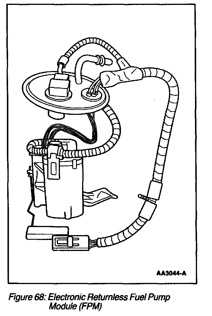 The fuel pump (FP) module (Figure 66), (Figure 67) and (Figure 68) is a device that contains the fuel pump and sender assembly. The fuel pump is located inside the FP module reservoir and supplies fuel through the FP module manifold to the engine and FP module jet pump. The jet pump continuously refills the reservoir with fuel, and a check valve located in the manifold outlet maintains system pressure when the fuel pump is not energized. A flapper valve located in the bottom of the reservoir allows fuel to enter the reservoir and prime the fuel pump during the initial fill.