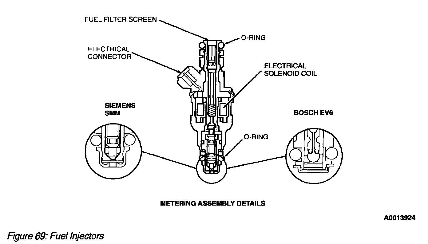 The fuel injector (Figure 69) is a solenoid-operated valve that meters fuel flow to the engine. The fuel injector is opened and closed a constant number of times per crankshaft revolution. The amount of fuel is controlled by the length of time the fuel injector is held open.