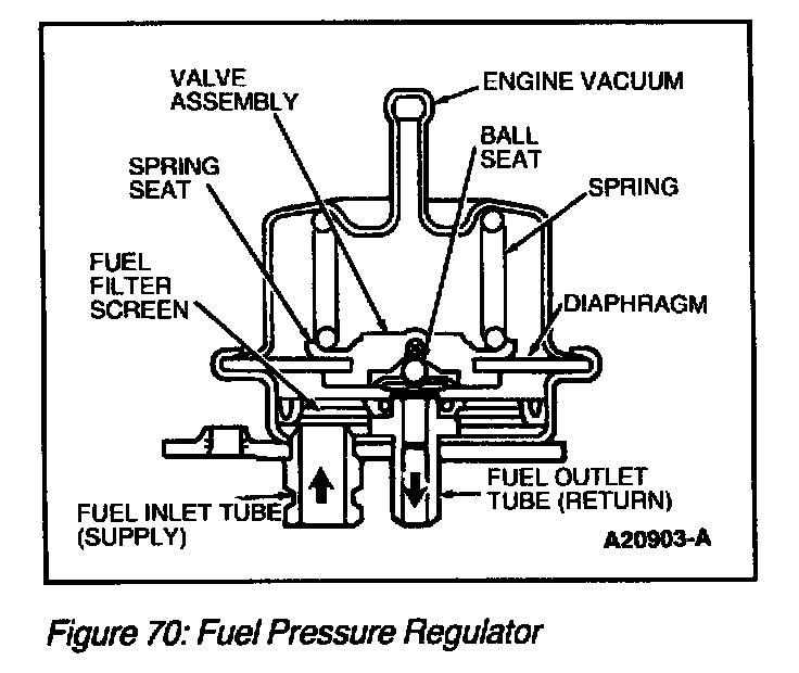 The fuel pressure regulator (Figure 70) is attached to the fuel rail downstream of the fuel injectors. It regulates fuel pressure supplied to the fuel injectors. The regulator is a diaphragm-operated relief valve. One side of the diaphragm senses fuel pressure and the other side is connected to the intake manifold vacuum. Fuel pressure is established by a spring preload applied to the diaphragm. Balancing one side of the diaphragm with manifold vacuum maintains a constant fuel pressure drop across the fuel injectors. Fuel pressure is high when engine vacuum is low. Excess fuel is bypassed through the fuel pressure regulator and returned through the fuel return line to the fuel tank.