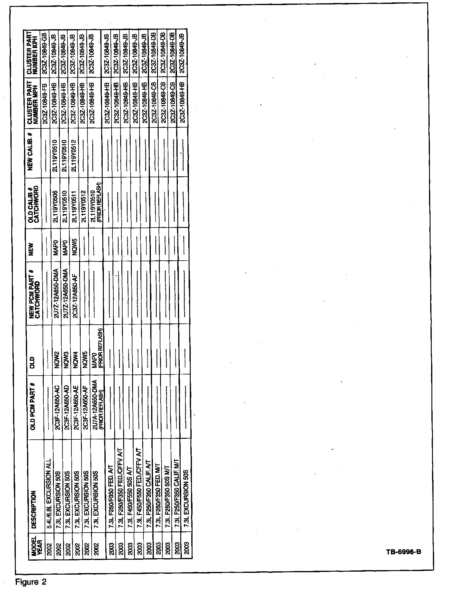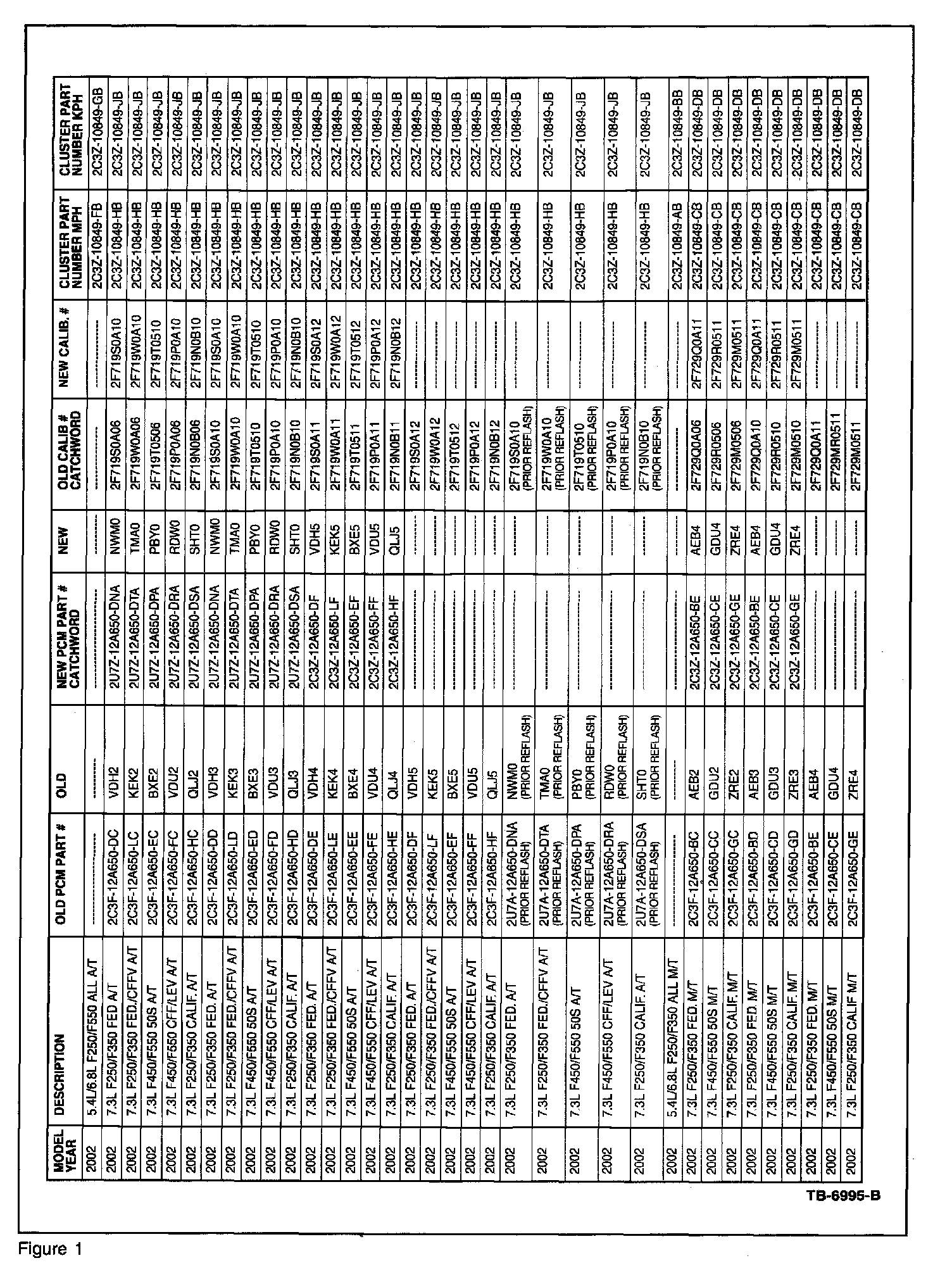 2. For 2002 7.3L applications, locate the vehicles existing calibration level in one of the calibration identification columns labeled "Old" (Old PCM Part #, Old Catchword, and/or Old Calib. #). Then determine the corresponding new calibration level (where applicable) and matching new cluster part number. If a new calibration level is not shown, only the instrument cluster needs to be replaced.