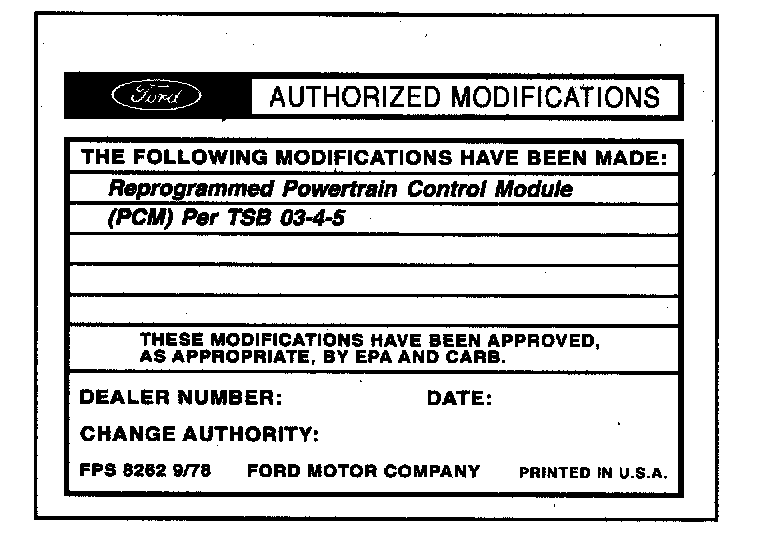 Obtain an Authorized Modifications Decal (FPS 8262 - obtainable through DOES II, 25/pkg) and list the date, dealer number, and summary of modifications performed. Select a prominent place adjacent to the Vehicle Emission Control Information Decal suitable for installing the Authorized Modifications Decal. Clean the area, install the decal, and cover it with a clear plastic decal shield.