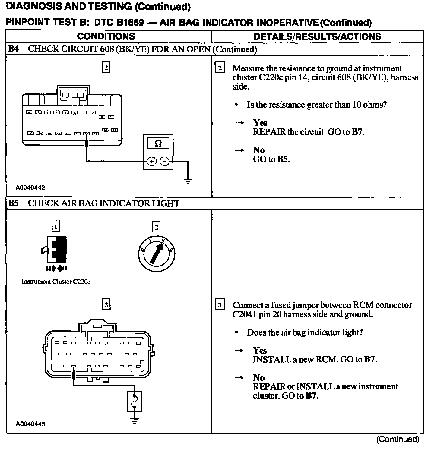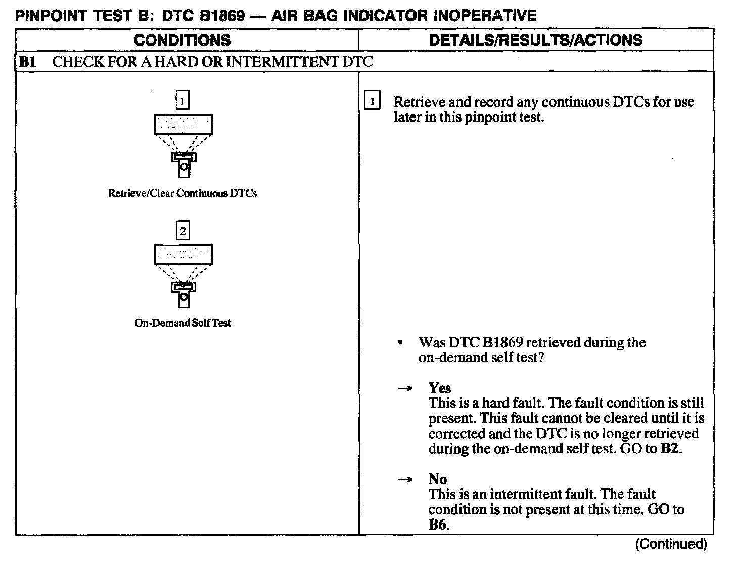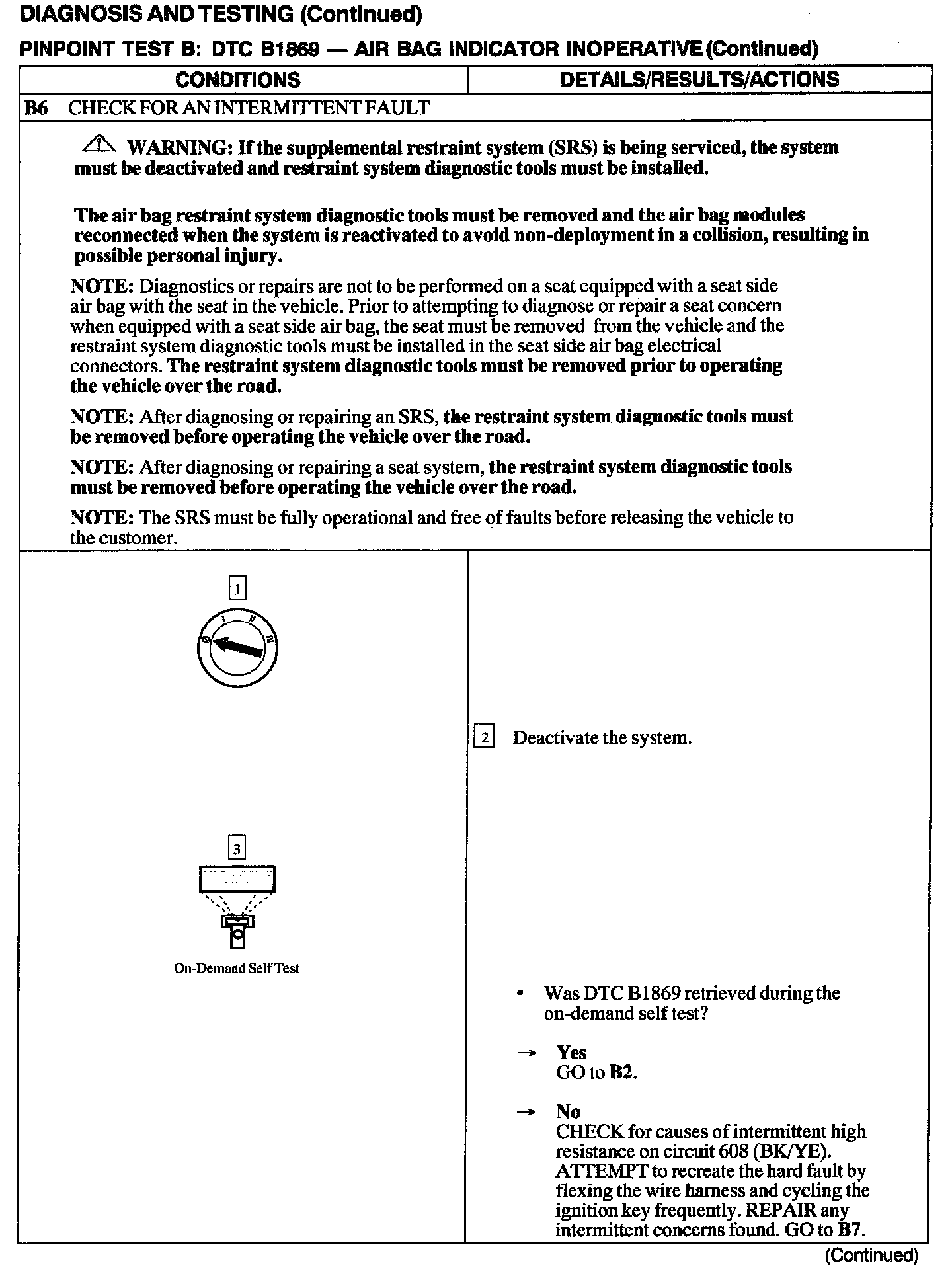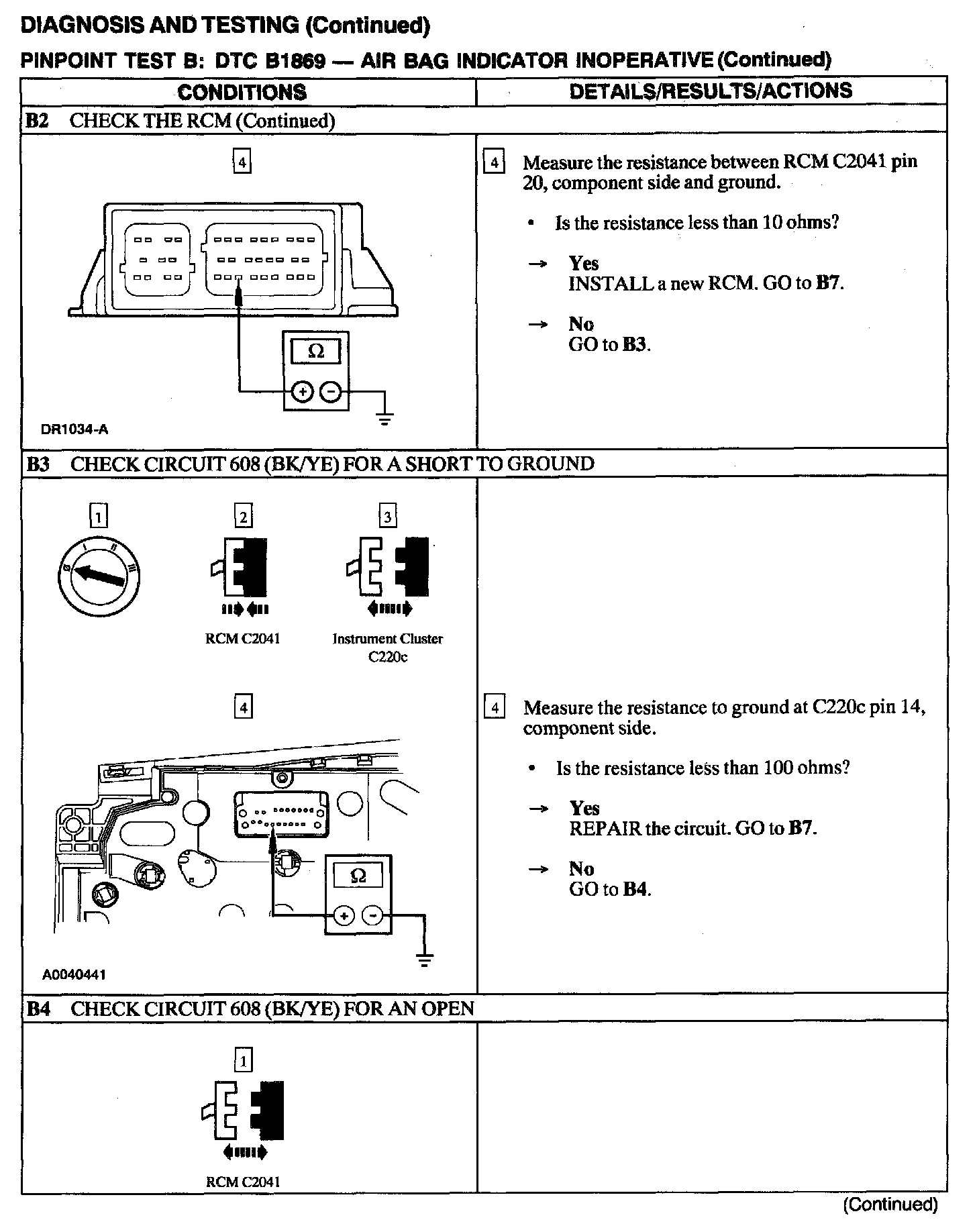 The Restraints Control Module (RCM) monitors the air bag indicator for open and short to ground conditions. If the RCM detects an open or short to ground condition on the air bag indicator circuit, it will store a Diagnostic Trouble Code (DTC) B1869 in memory.