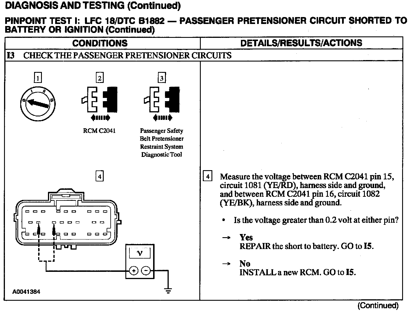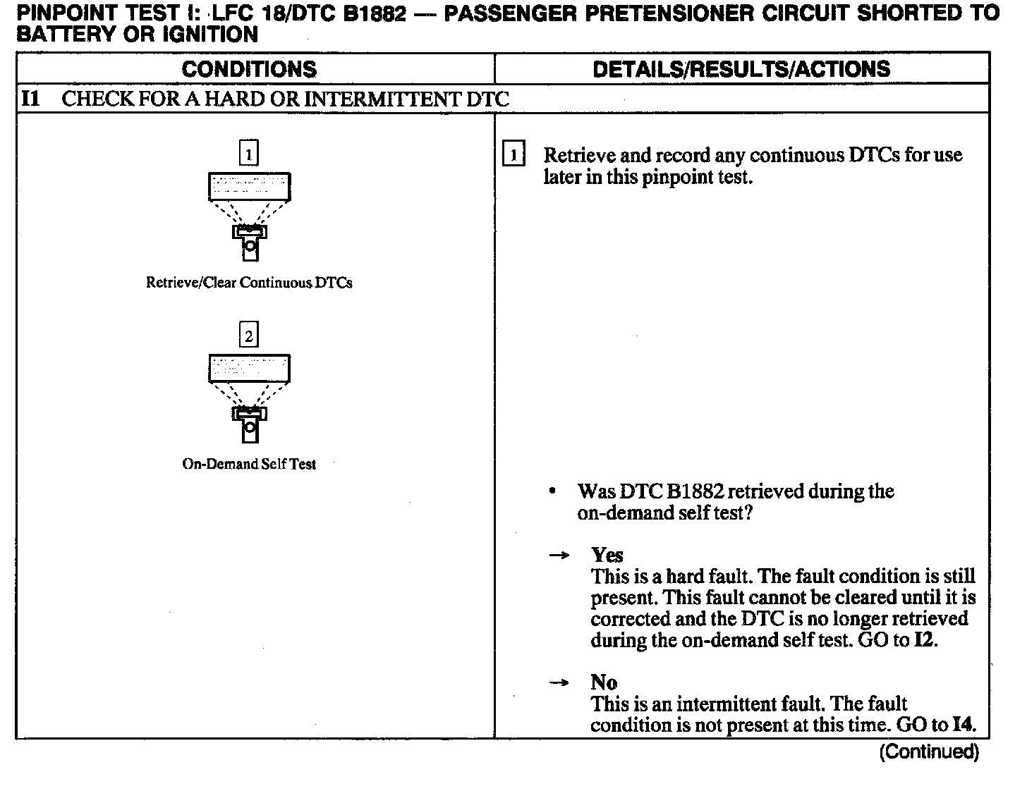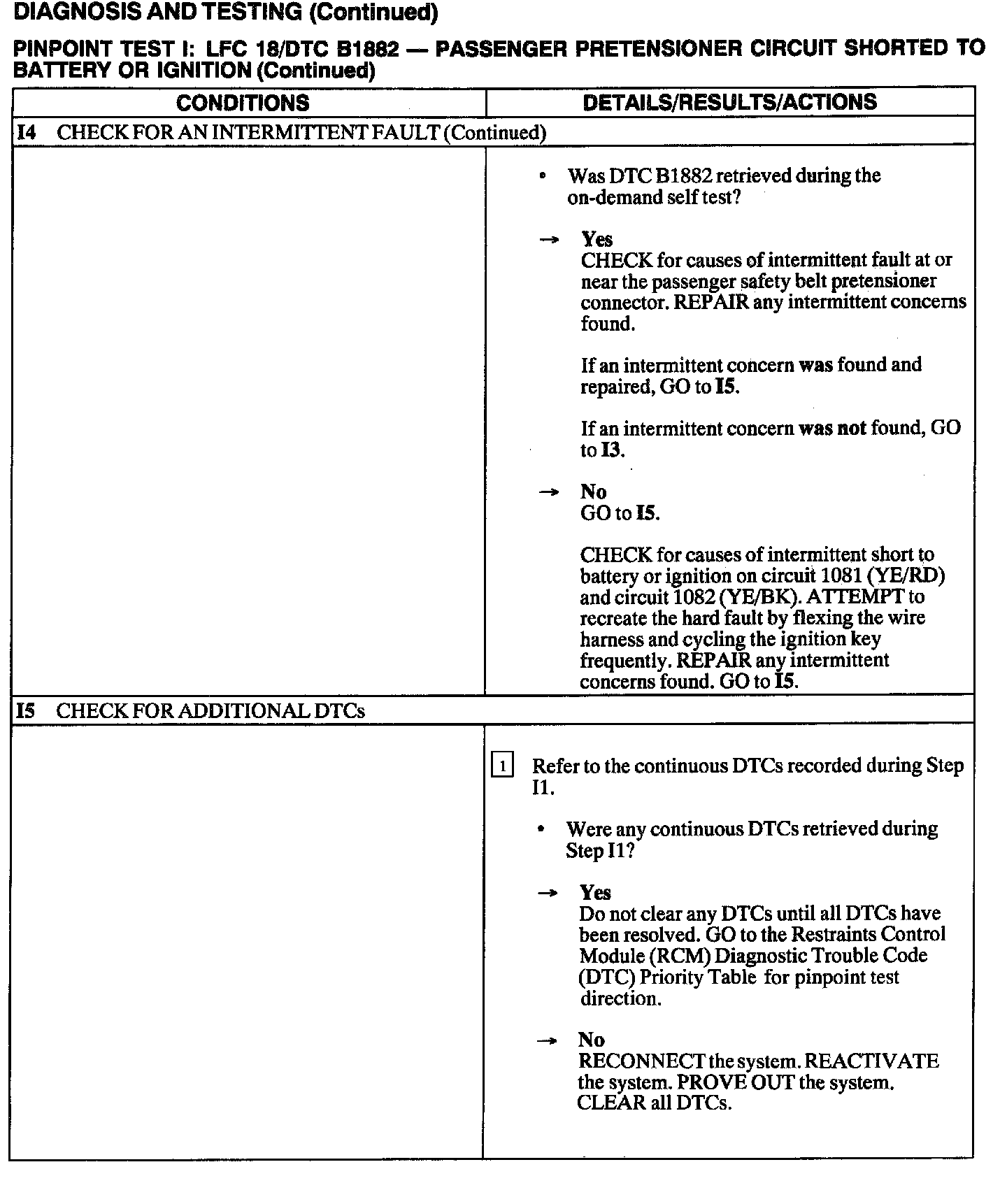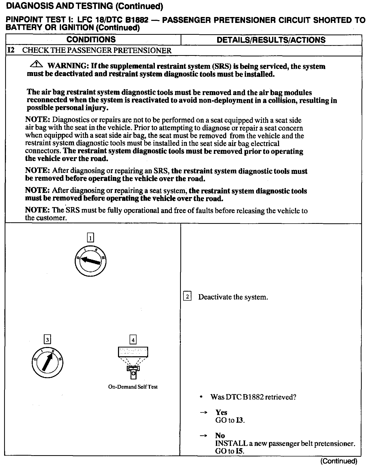 The Restraints Control Module (RCM) monitors the circuit to the passenger safety belt pretensioner. When the RCM detects a circuit short to battery or ignition it will set Lamp Fault Code (LFC) 18 and Diagnostic Test Code (DTC) 1882.