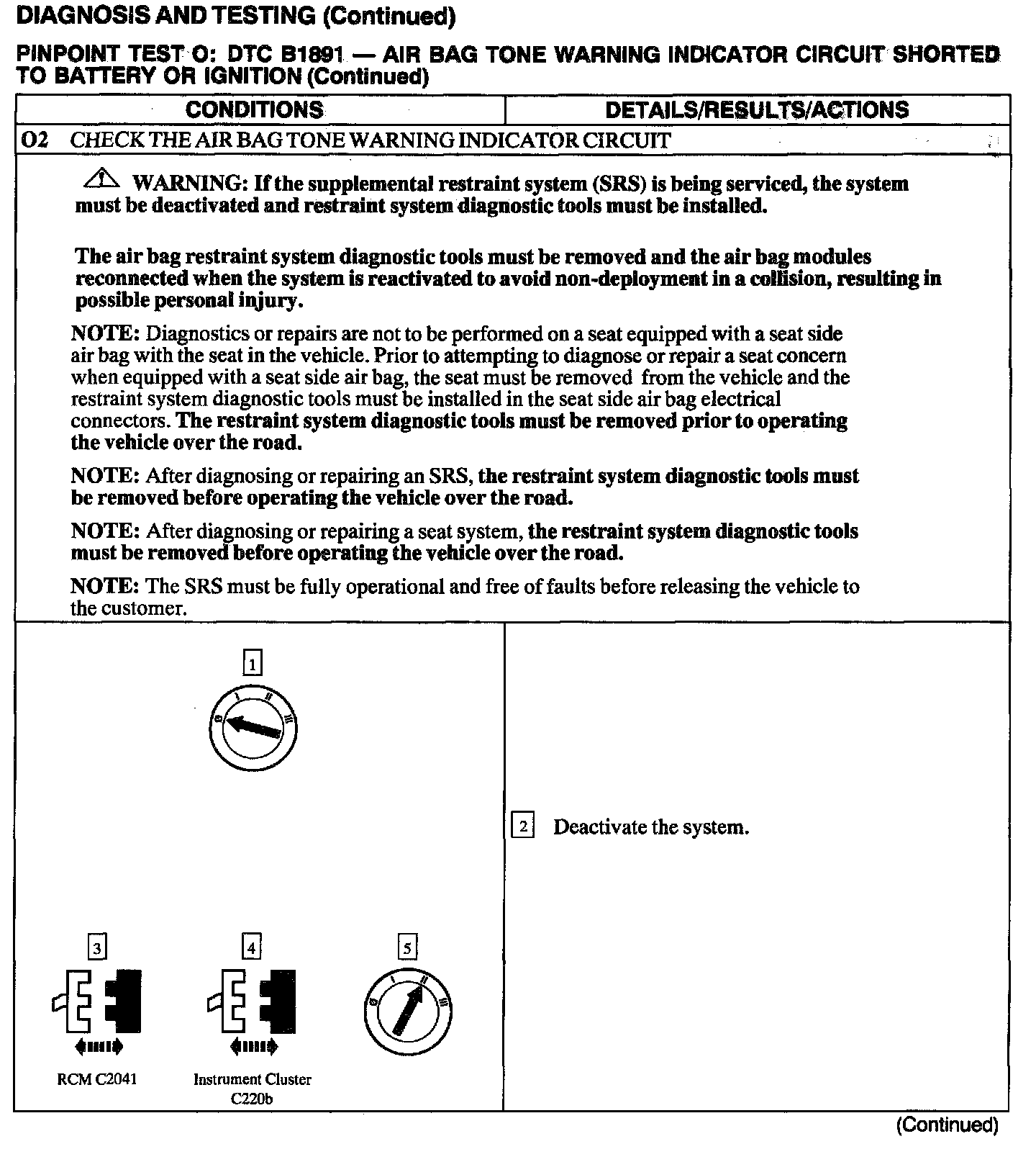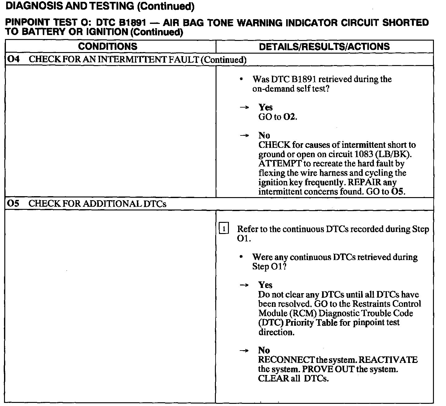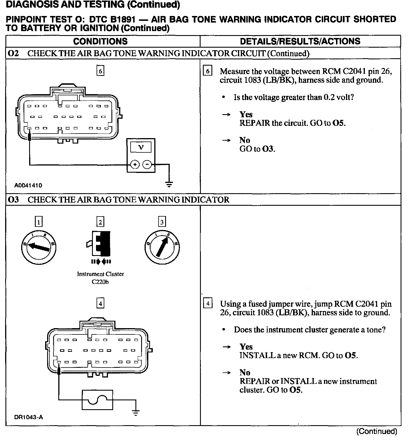 The Restraints Control Module (RCM) monitors its connection to the Instrument Cluster at pin 26. This connection is used to signal a chime if the air bag indicator is inoperative and another SRS fault exists. If the RCM detects a short to battery or ignition on the connection to the Instrument Cluster, it Will store a Diagnostic Trouble Code (DTC) B1891 in memory.