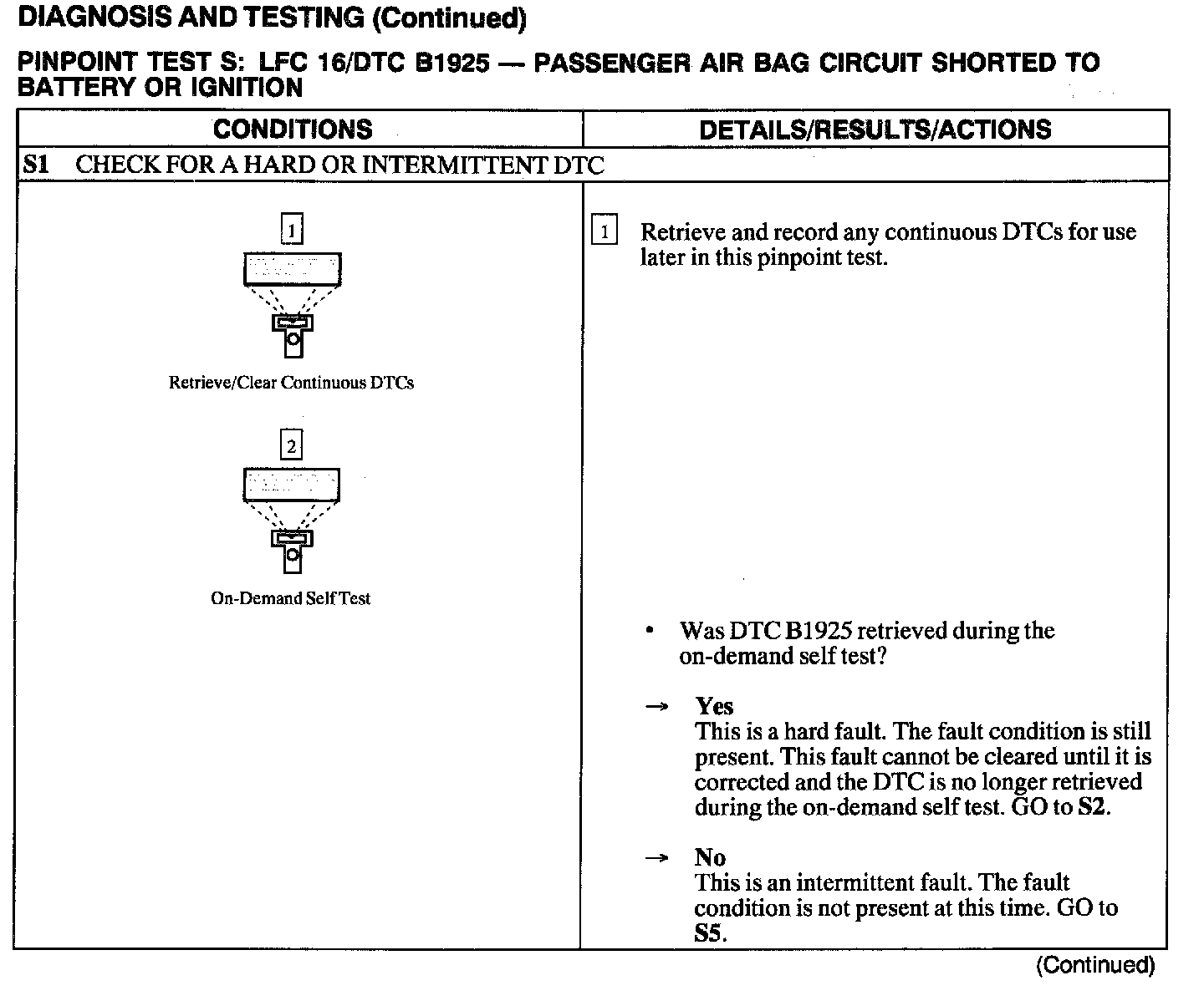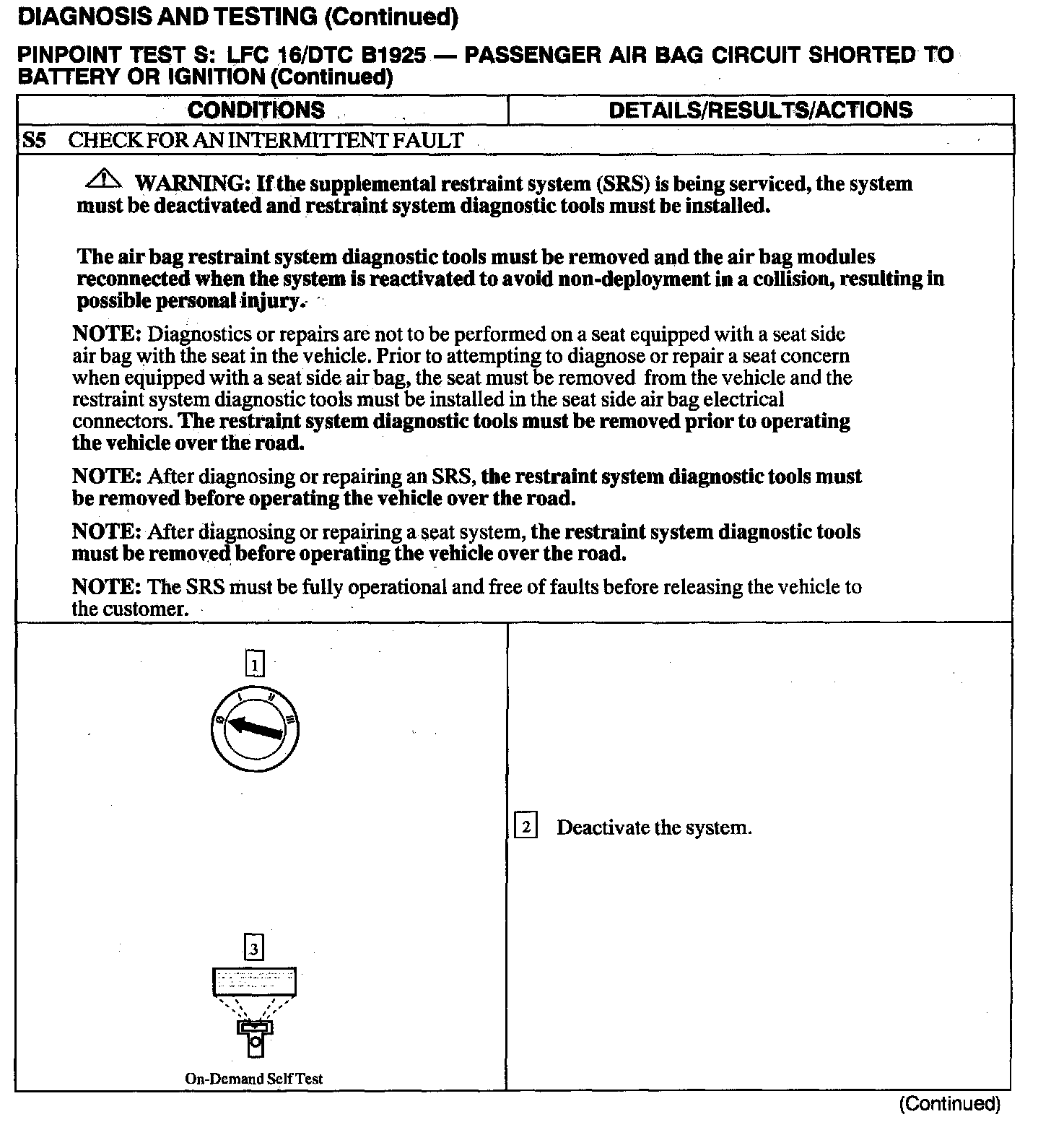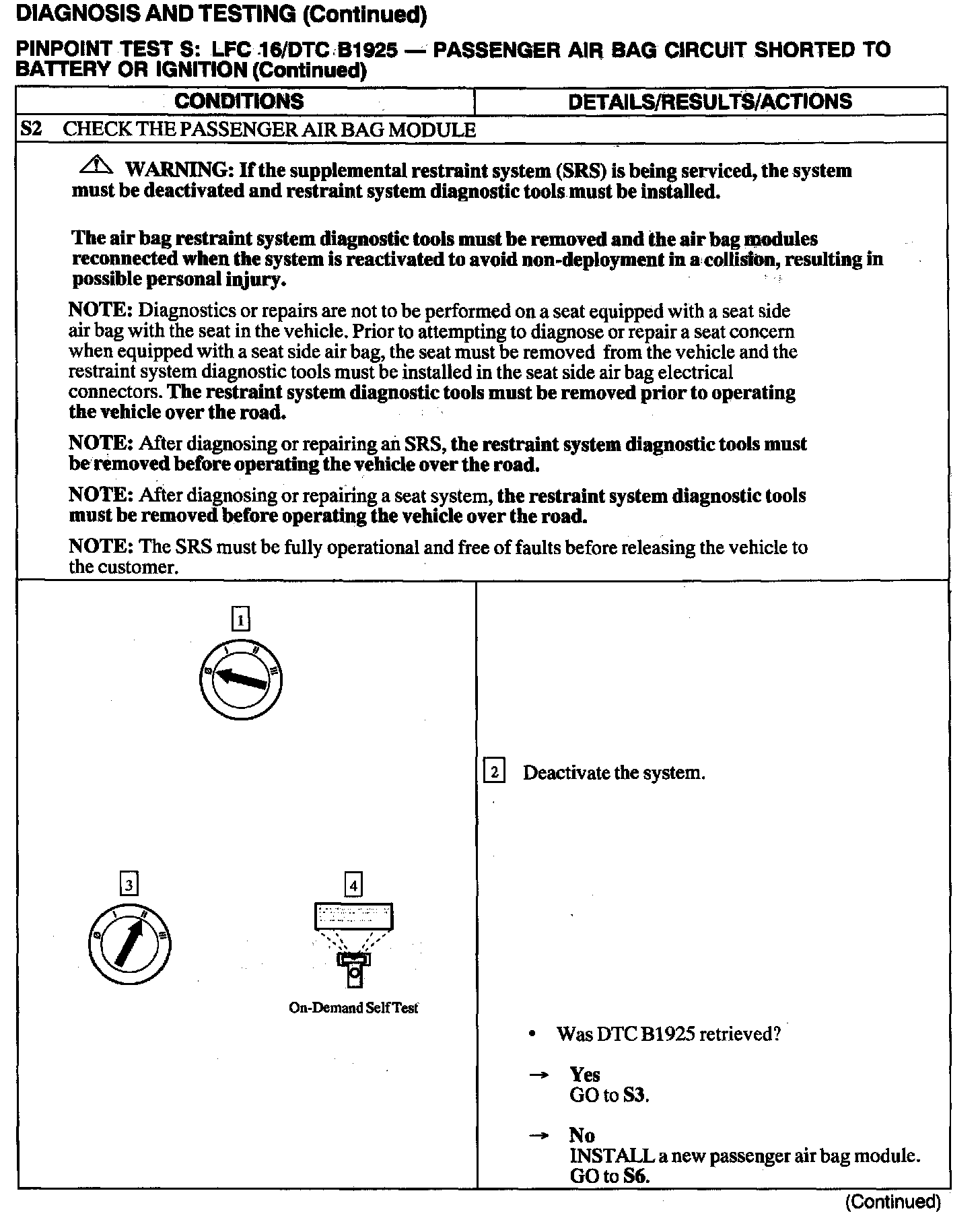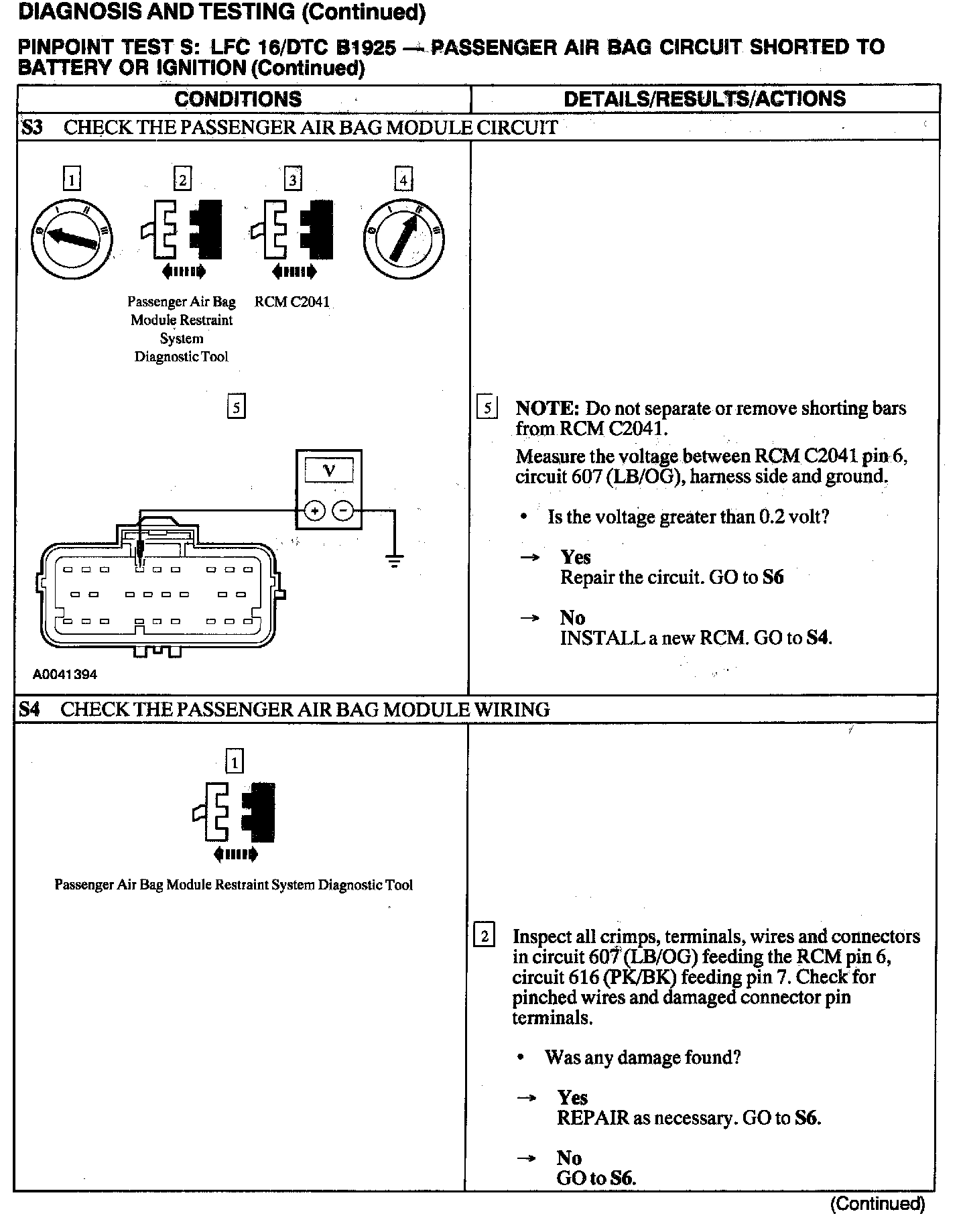 The Restraints Control Module (RCM) checks for passenger air bag circuit shorts to battery or ignition by monitoring the voltage of circuits 607 (LB/OG) and 616 (PK/BK) at pins 6 and 7. If the RCM detects a short to battery or ignition on either of these pins, it will store a Diagnostic Trouble Code (DTC) B1925 in memory and flash a Lamp Fault Code (LFC) 16 (or higher priority code if one exists) on the air bag indicator.