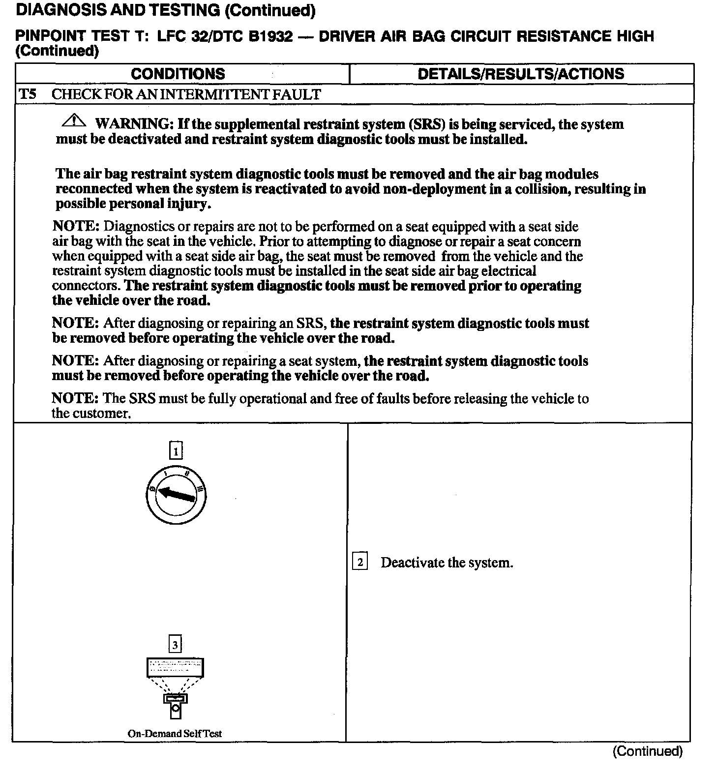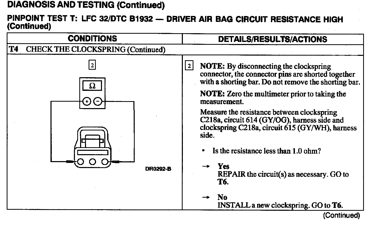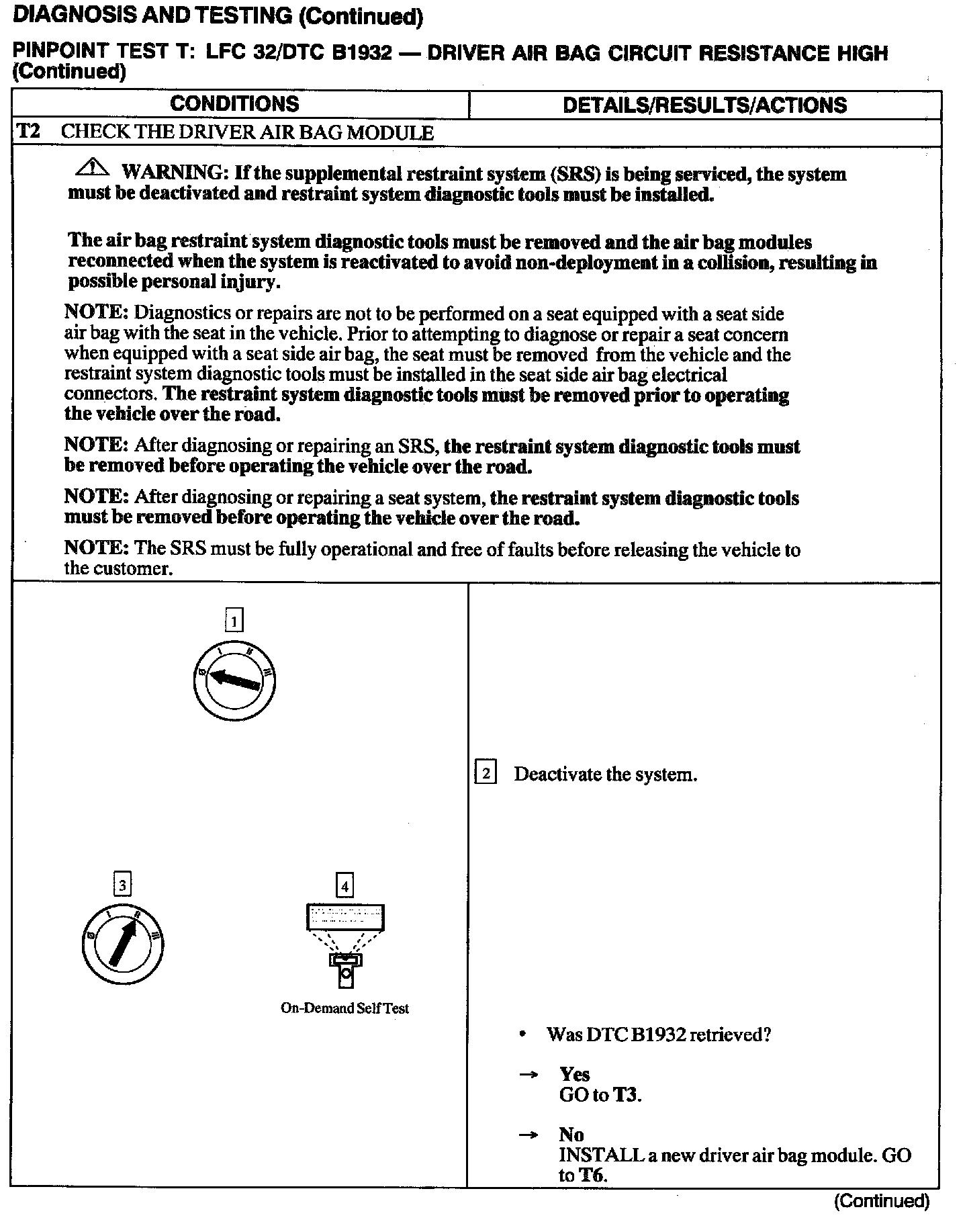The Restraints Control Module (RCM) monitors the resistance for the driver air bag ignitor by measuring the resistance between pins 3 and 4. If the RCM detects high resistance between these pins, it will store a Diagnostic Trouble Code (DTC) B1932 in memory and flash a Lamp Fault Code (LFC) 32 (or higher priority code if one exists) on the air bag indicator.
