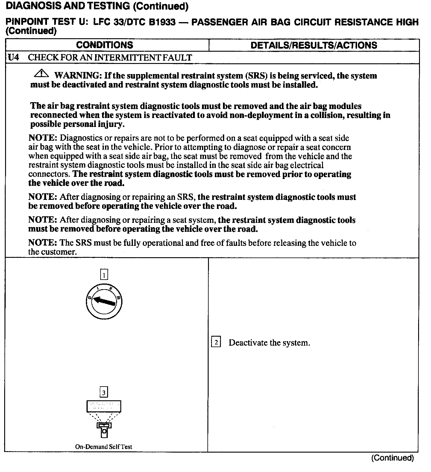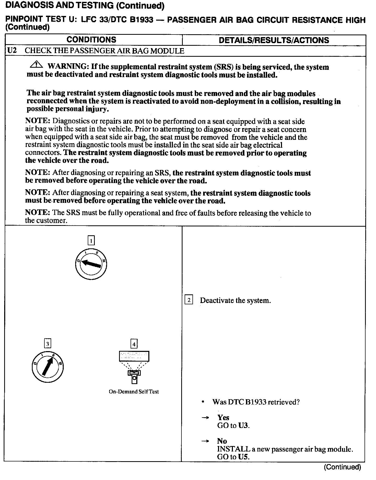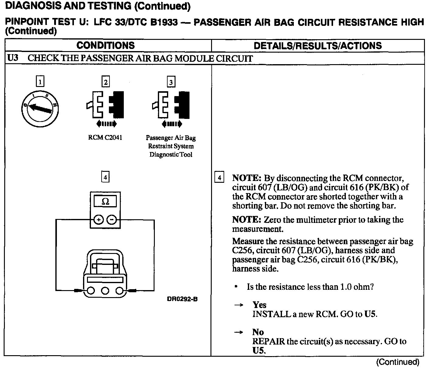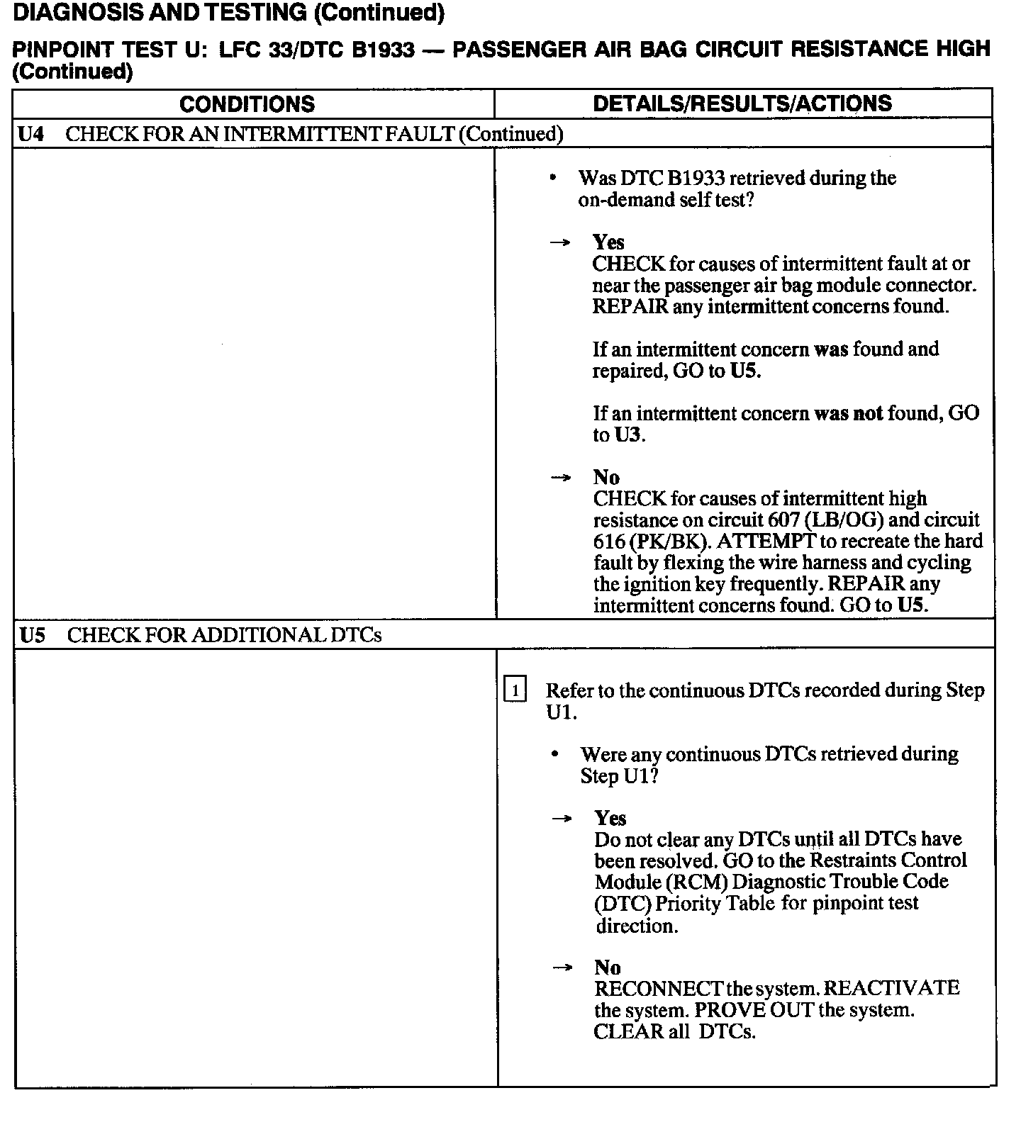 The Restraints Control Module (RCM) monitors the resistance of the passenger air bag ignitor by measuring the resistance between pins 6 and 7. If the RCM detects high resistance between these pins, it will store a Diagnostic Trouble Code (DTC) B1933 in memory and flash a Lamp Fault Code (LFC) 33 (or higher priority code if one exists) on the air bag indicator.