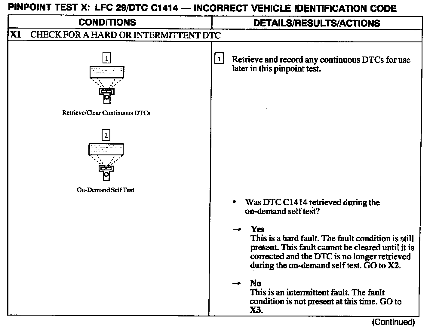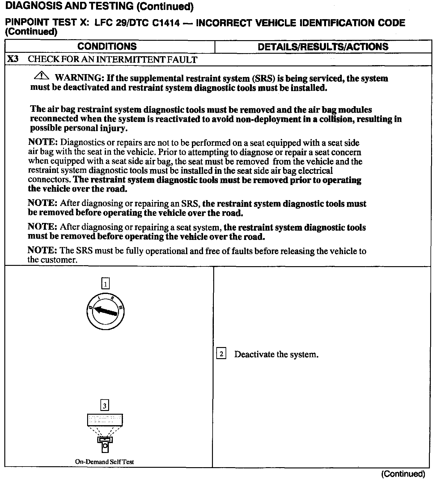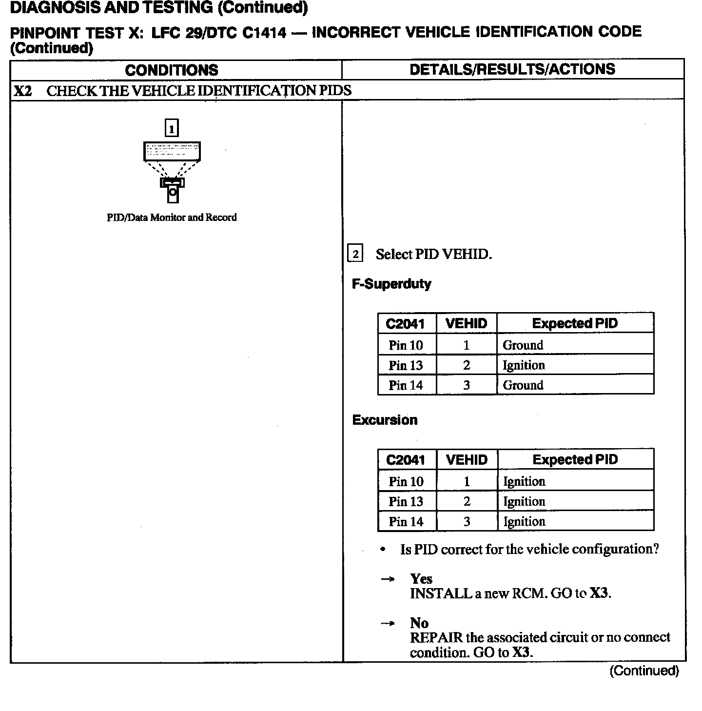 The Restraint Control Module (RCM) monitors the electrical condition at C2041 pins 10, 13 and 14 to determine if it is installed on the correct vehicle. Each vehicle configuration will have a unique vehicle ID. If the RCM detects other than the expected programmed condition on any of these pins, it will store Diagnostic Trouble Code (DTC) C1414 in memory and flash a Lamp Fault Code (LFC) 29 (or higher priority code if one exists) on the air bag indicator.
