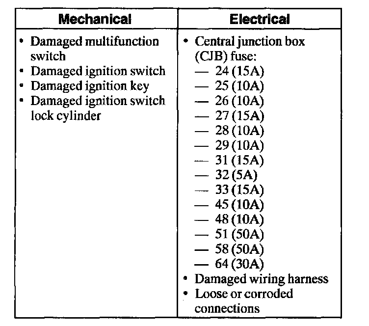 2. Visually inspect for obvious signs of mechanical and electrical damage. If equipped with manual transmission, the key release button prevents rotation of the ignition switch lock cylinder to LOCK or ACC positions unless the key release button is depressed.