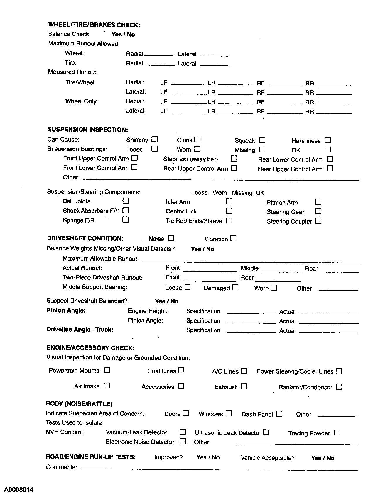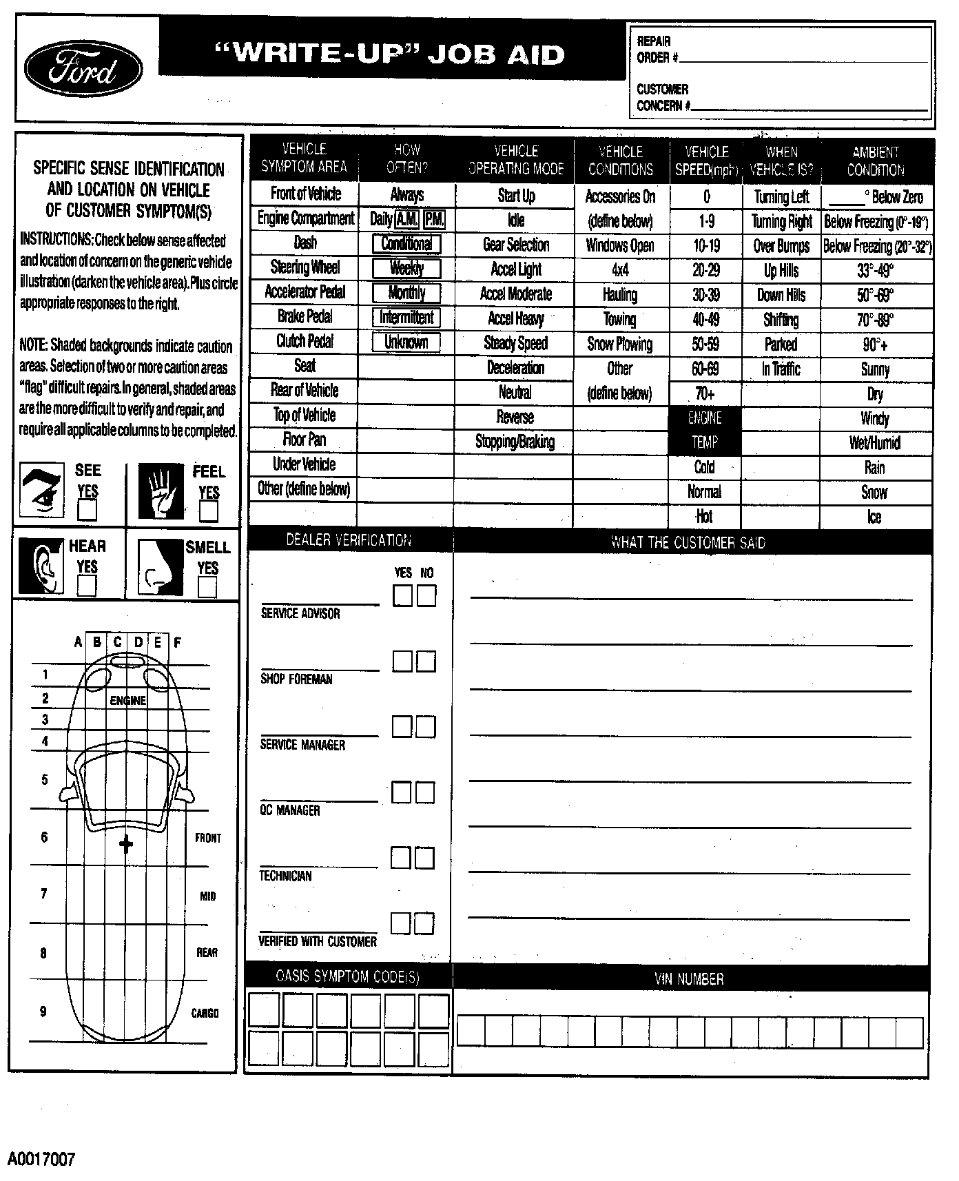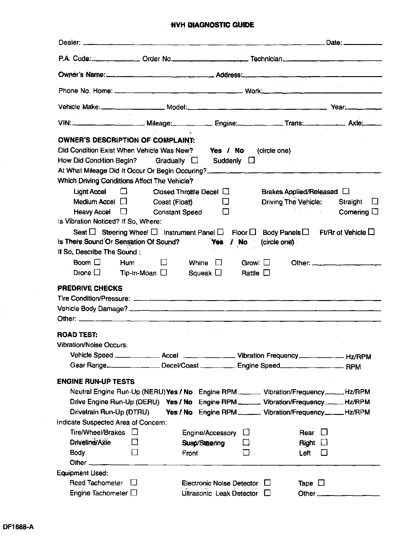 To assist the service advisor and the technician, a Write-up Job Aid and an NVH Diagnostic Guide are included with this material. The Write-up Job Aid serves as a place to record all important symptom information. The NVH Diagnostic Guide serves as a place to record information reported on the Write-up Job Aid as well as data from the testing to be carried out.