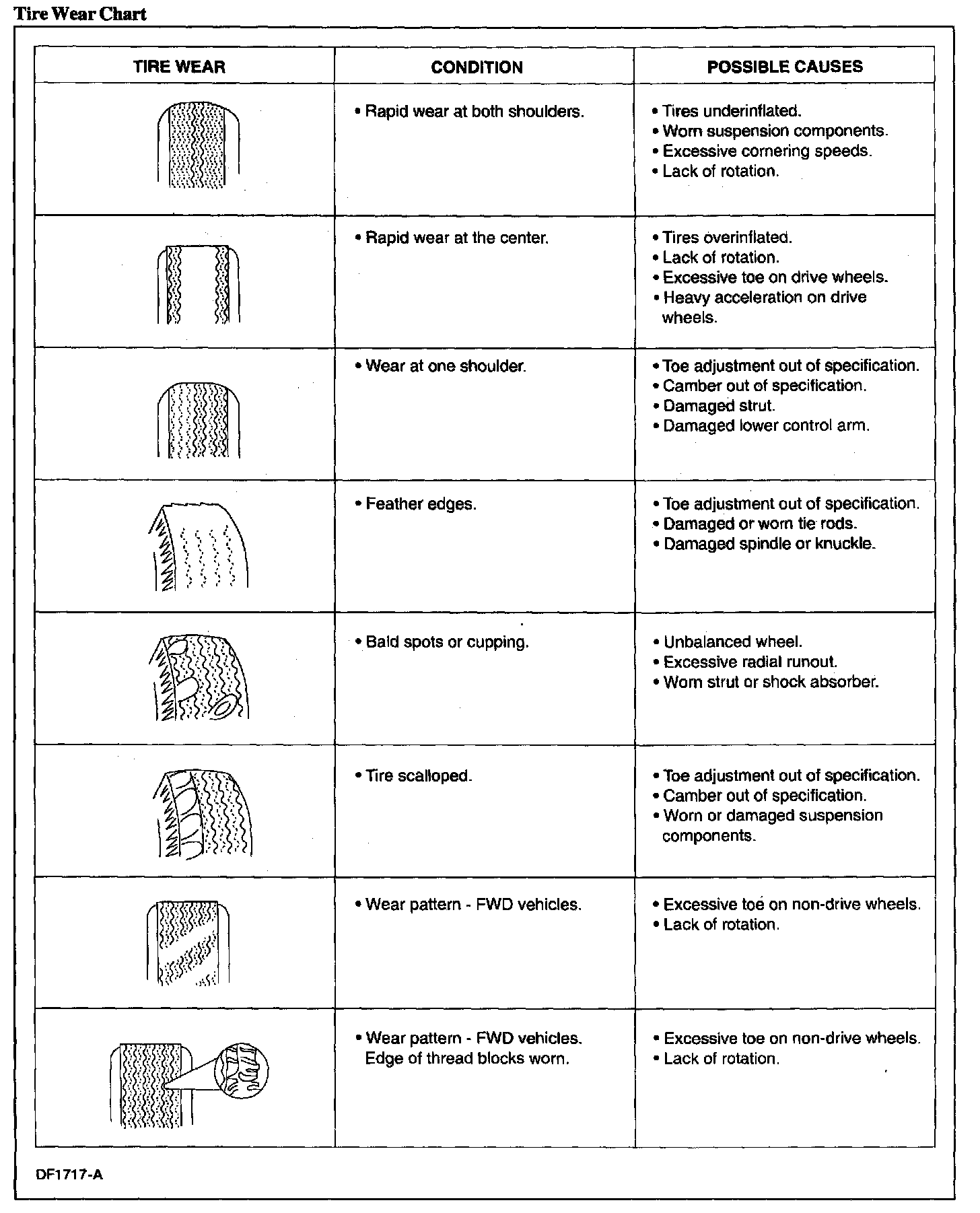 Careful attention must be paid to the tire and wheels. There are several symptoms that can be caused by damaged or worn tire and wheels. Carry out a careful visual inspection of the tires and wheel assemblies. Spin the tires slowly and watch for signs of lateral or radial runout. Refer to the tire wear chart to determine the tire wear conditions and actions.