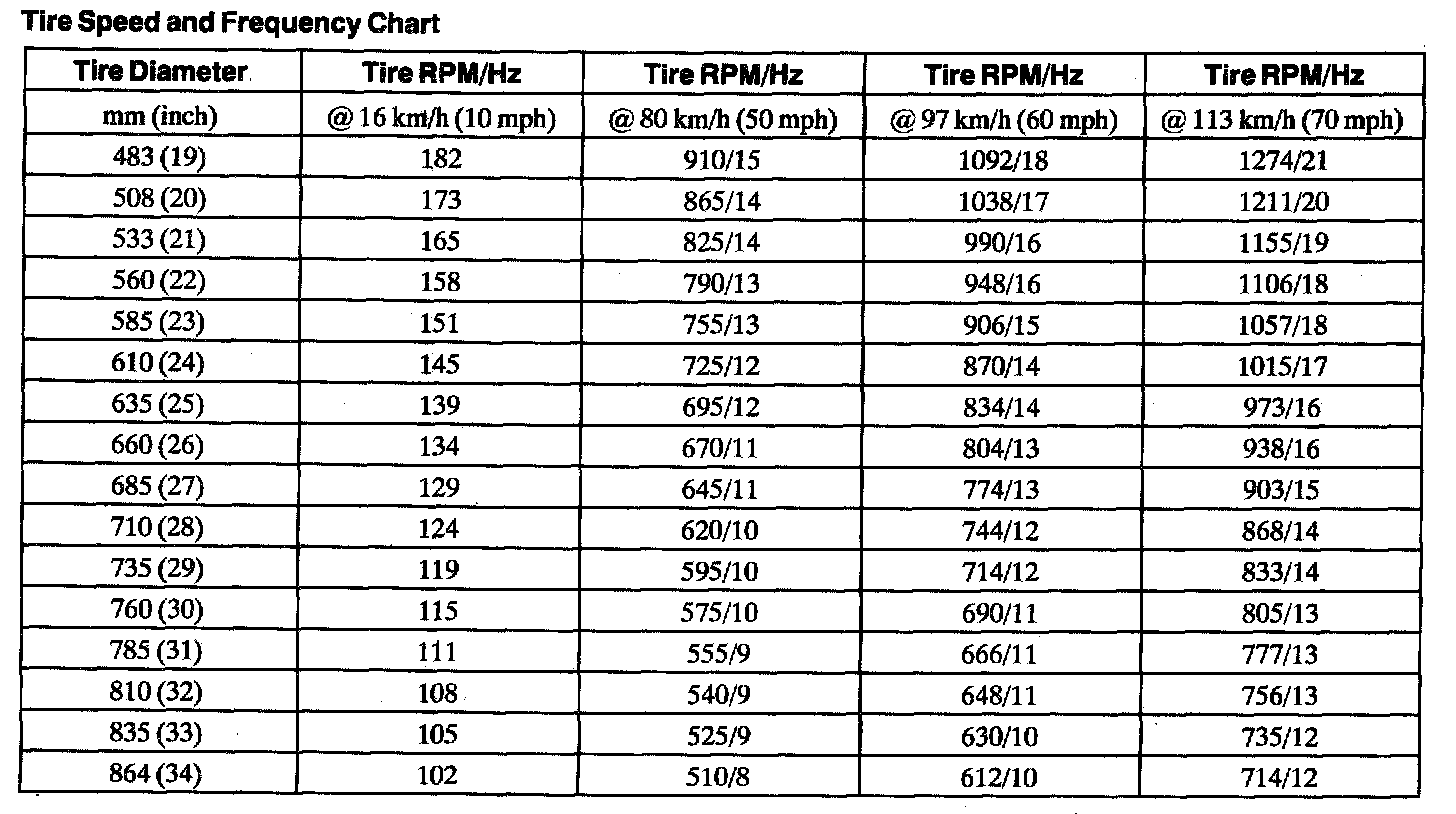 ^ Obtain the corresponding tire and wheel rpm and frequency from the Tire Speed and Frequency Chart.