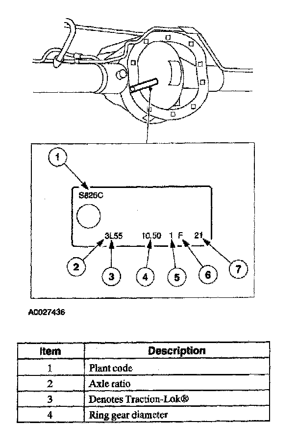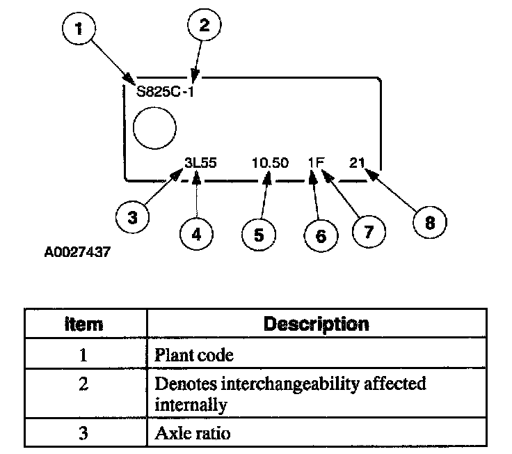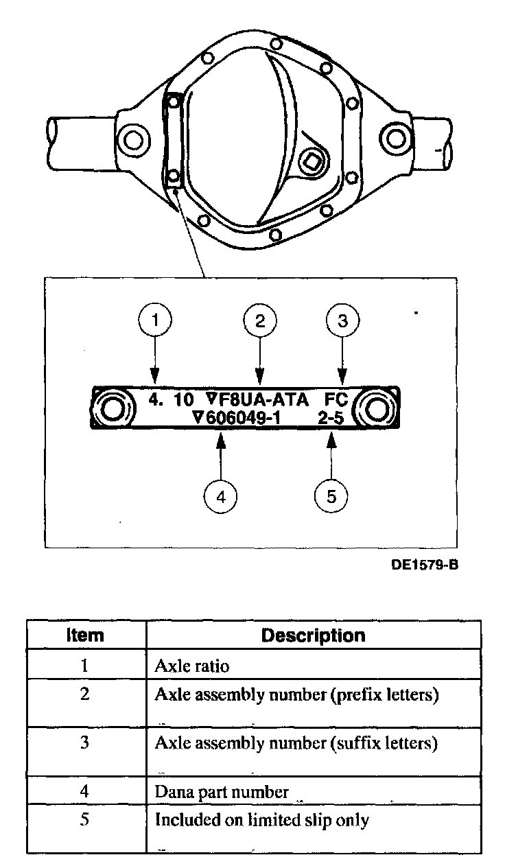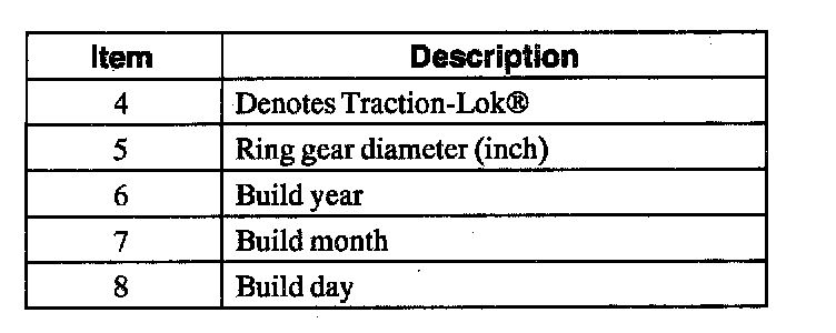 The axle identification tag identifies a particular axle design, a specific ratio, and if it is a conventional or limited slip (Traction-Lok) type. In addition, the plant code will not change as long as that particular axle assembly never undergoes an external design change. If, however, an internal design change takes place during the production life of the axle and that internal change affects parts interchangeability, a dash and numerical suffix is added to the plant code. This means that as an assembly both axles are interchangeable; however, internally they are different. Therefore, each requires different internal parts at the time of repair.