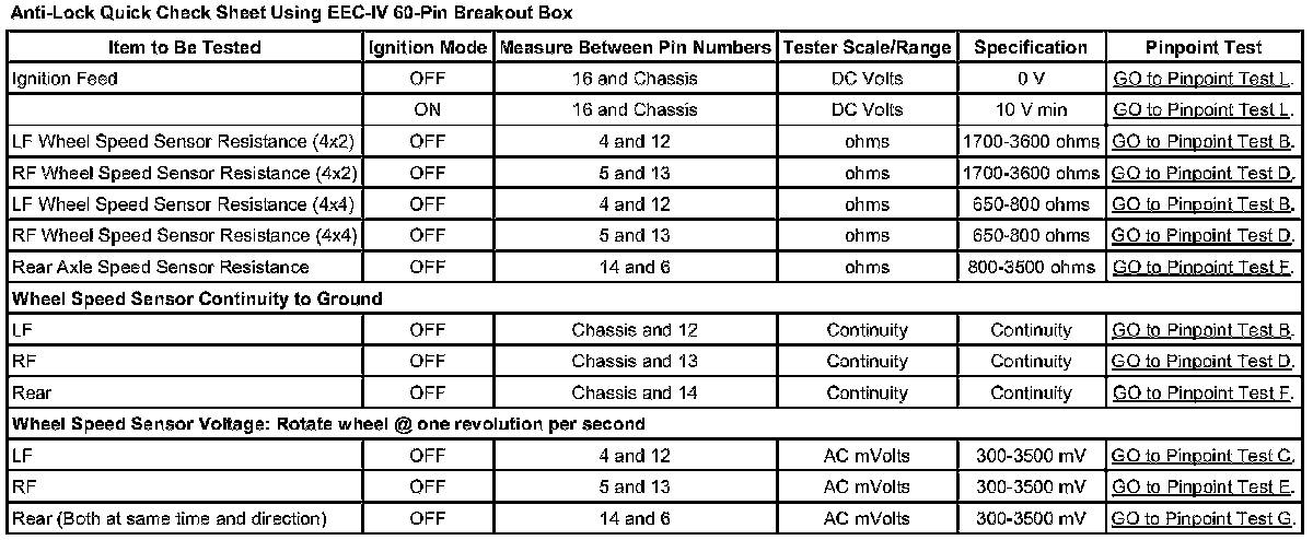 Anti-Lock Quick Check Sheet Using EEC-IV 60-Pin Breakout Box
