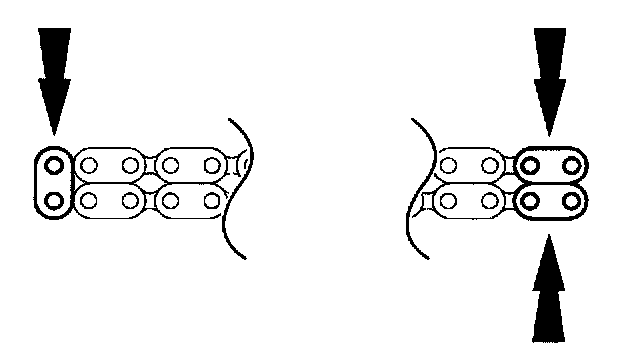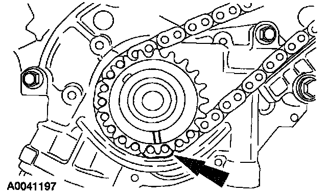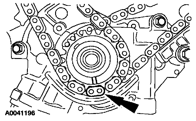 19. Position the lower end of the LH (inner) timing chain on the crankshaft sprocket, aligning the timing mark on the outer flange of the crankshaft sprocket with the single copper (marked) link on the chain.