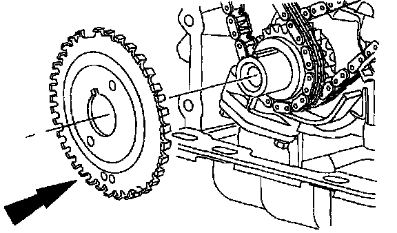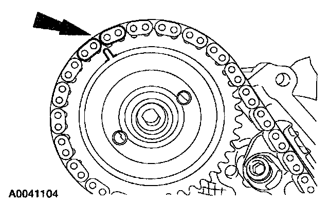 Position the timing chain on the camshaft sprocket with the camshaft sprocket timing mark positioned between the two copper (marked) chain links.