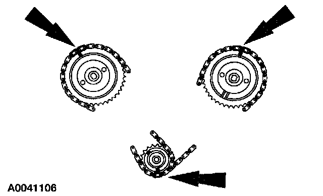 Position the RH timing chain on the camshaft sprocket. Make sure the camshaft sprocket timing mark is positioned between the two copper (marked) chain links.