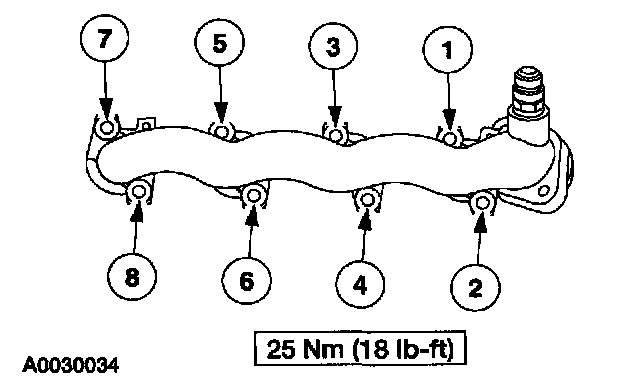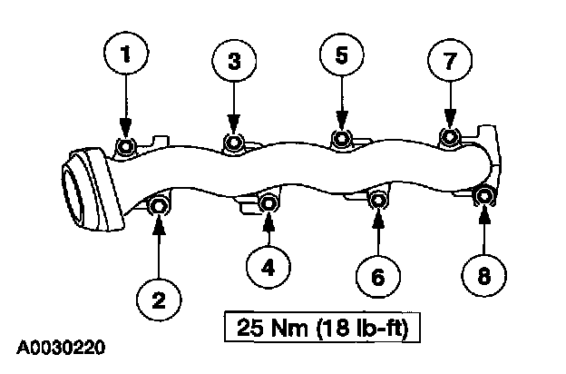 9. Install the LH exhaust manifold and the exhaust manifold gaskets. Tighten the nuts in the sequence shown.