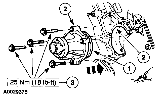 57. CAUTION: Do not rotate the water pump housing once the water pump has been positioned in the cylinder block. Damage to the O-ring seal will occur.