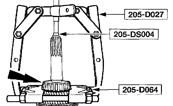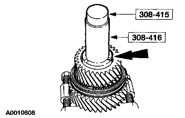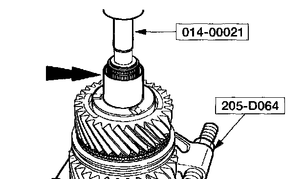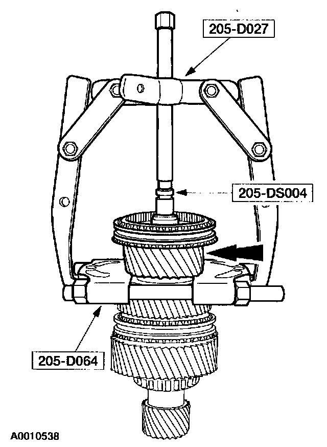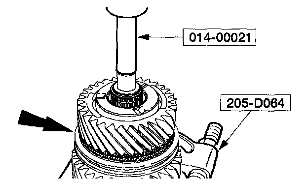 14. Using the special tool, press the mainshaft second gear thrust washer, the mainshaft second gear, the mainshaft needle bearing, the mainshaft gear bushing, first and second synchronizer assembly and mainshaft first gear.
