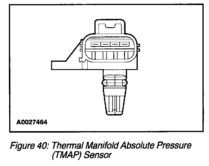 The Thermal Manifold Absolute Pressure Sensor (TMAP) (Figure 40) consists of a Manifold Absolute Pressure (MAP) sensor and an integrated thermistor. The thermistor part of the sensor is currently not being used. The MAP part of the sensor measures intake manifold air absolute pressure. The PCM uses information from the MAP sensor, Throttle Position (TP) sensor, mass air flow (MAF) sensor, engine coolant temperature (ECT) or cylinder head temperature (CHT) sensor and crankshaft position (CKP) sensor to determine how much exhaust gas is introduced into the intake manifold.