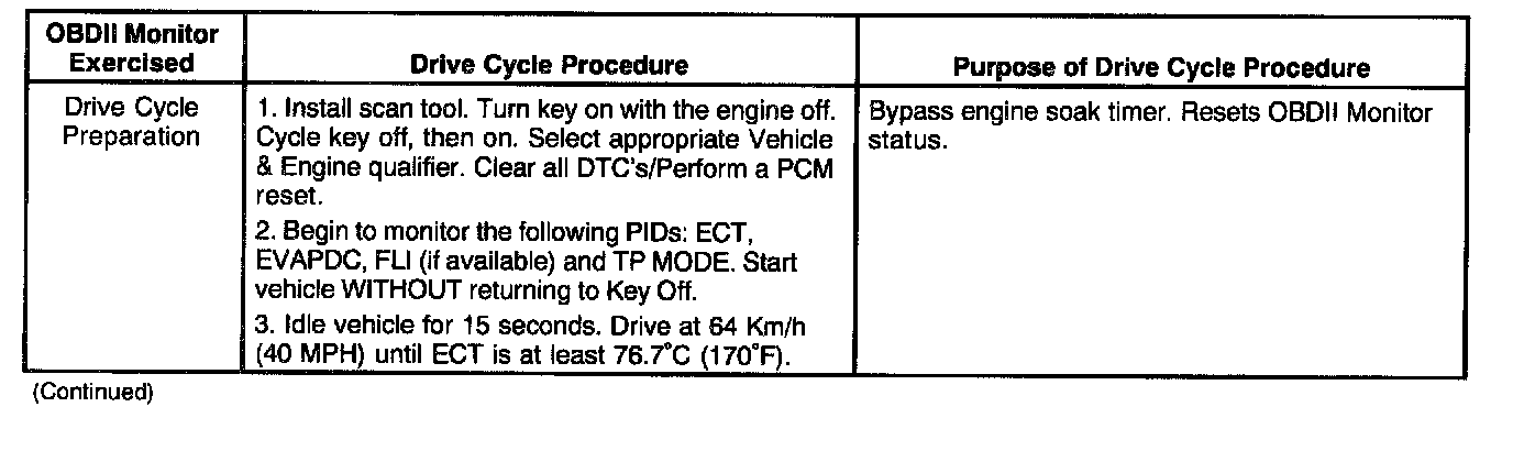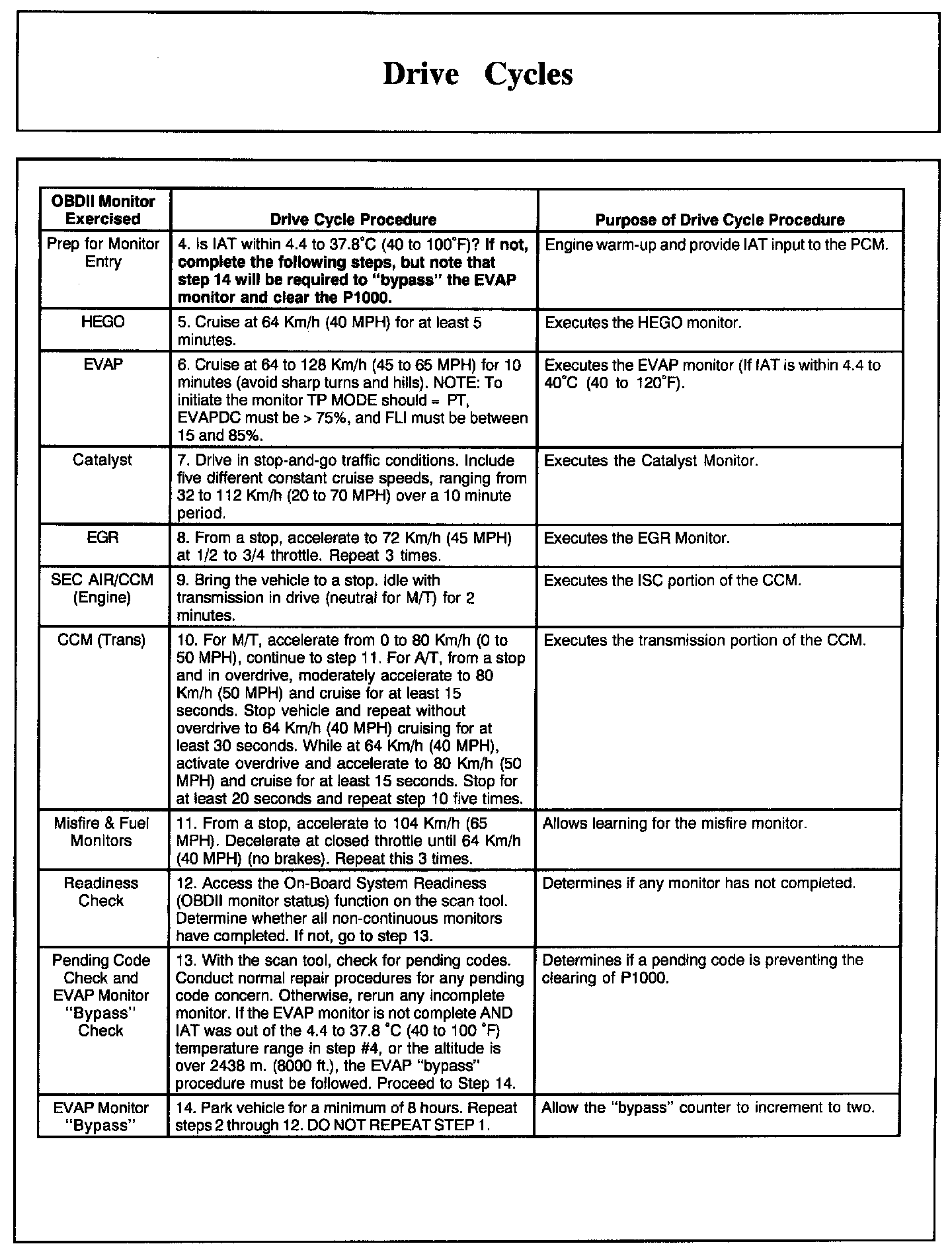 Description of OBD II Drive CycleThe following procedure is designed to execute and complete the OBDII monitors and to clear the Ford P1000, I/M readiness code. To complete a specific monitor for repair verification, follow steps 1 through 4, then continue with the step described by the appropriate monitor found under the "OBDII Monitor Exercised" column. When the ambient air temperature is outside 4.4 to 37.8°C (40 to 100°F), or the altitude is above 2438 meters (8000 feet), the Evaporative Emission (EVAP) monitor will not run. If the P1000 code must be cleared in these conditions, the PCM must detect them once (twice on some applications) before the EVAP monitor can be "bypassed" and the P1000 cleared. The EVAP "bypassing" procedure is described in the following drive cycle.